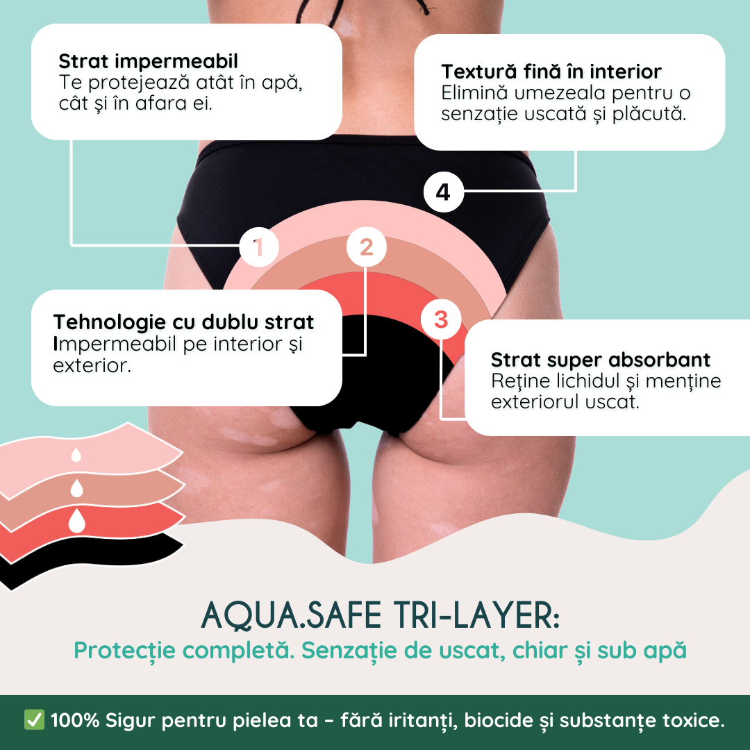 Slipul menstrual Femi.Eko® iti ofera libertatea de a te bucura de plaja, piscina sau spa chiar si in timpul menstruatiei, fara griji si fara utilizarea tampoanelor interne. Conceput din materiale impermeabile si respirabile de inalta calitate, slipul asigura protectie eficienta, confort si discretie. Este potrivit atat pentru adolescente, cat si pentru femei active care isi doresc siguranta si incredere in orice context. Designul ergonomic, materialele moi si structura in mai multe straturi permit absorbtia eficienta a lichidelor, mentinand pielea uscata si confortabila pe tot parcursul zilei.