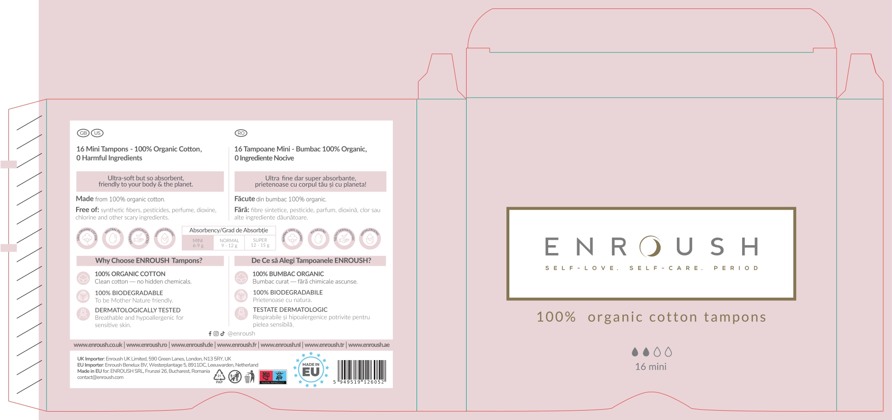 Testate dermatologic și ginecologic, tampoanele Enroush sunt potrivite pentru orice zi a fluxului menstrual fiind disponibile în 3 dimensiuni: mini, normal și super.