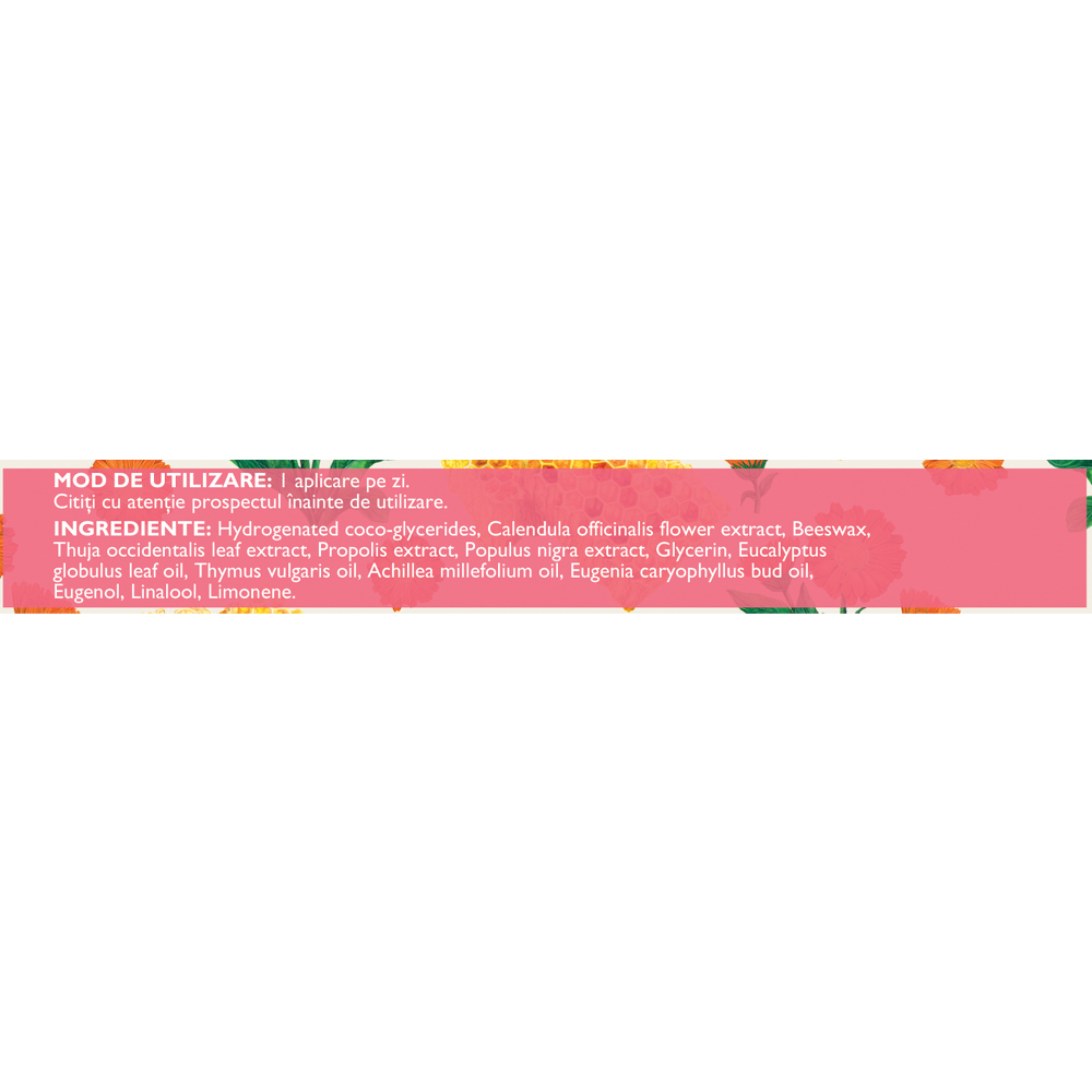 hydrogenated coco-glycerides, calendula officinalis flower extract, beeswax, thuja occidentalis leaf extract, propolis extract, populus nigra extract, glycerin, eucalyptus globulus leaf oil, thymus vulgaris oil, achillea millefolium oil, eugenia caryophyllus bud oil, eugenol, linalool, limonene