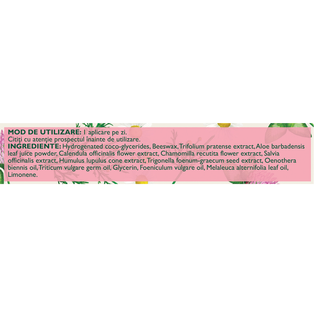 hydrogenated coco-glycerides, beeswax, Trifolium pratense extract, Aloe barbadensis leaf juice powder, Calendula officinalis flower extract, Chamomilla recutita flower extract, Salvia officinalis extract, Humulus lupulus cone extract, Trigonella foenum-graecum seed extract, Oenothera biennis oil, Triticum vulgare germ oil, Glycerin, Foeniculum vulgare oil, Melaleuca alternifolia leaf oil, Limonene.