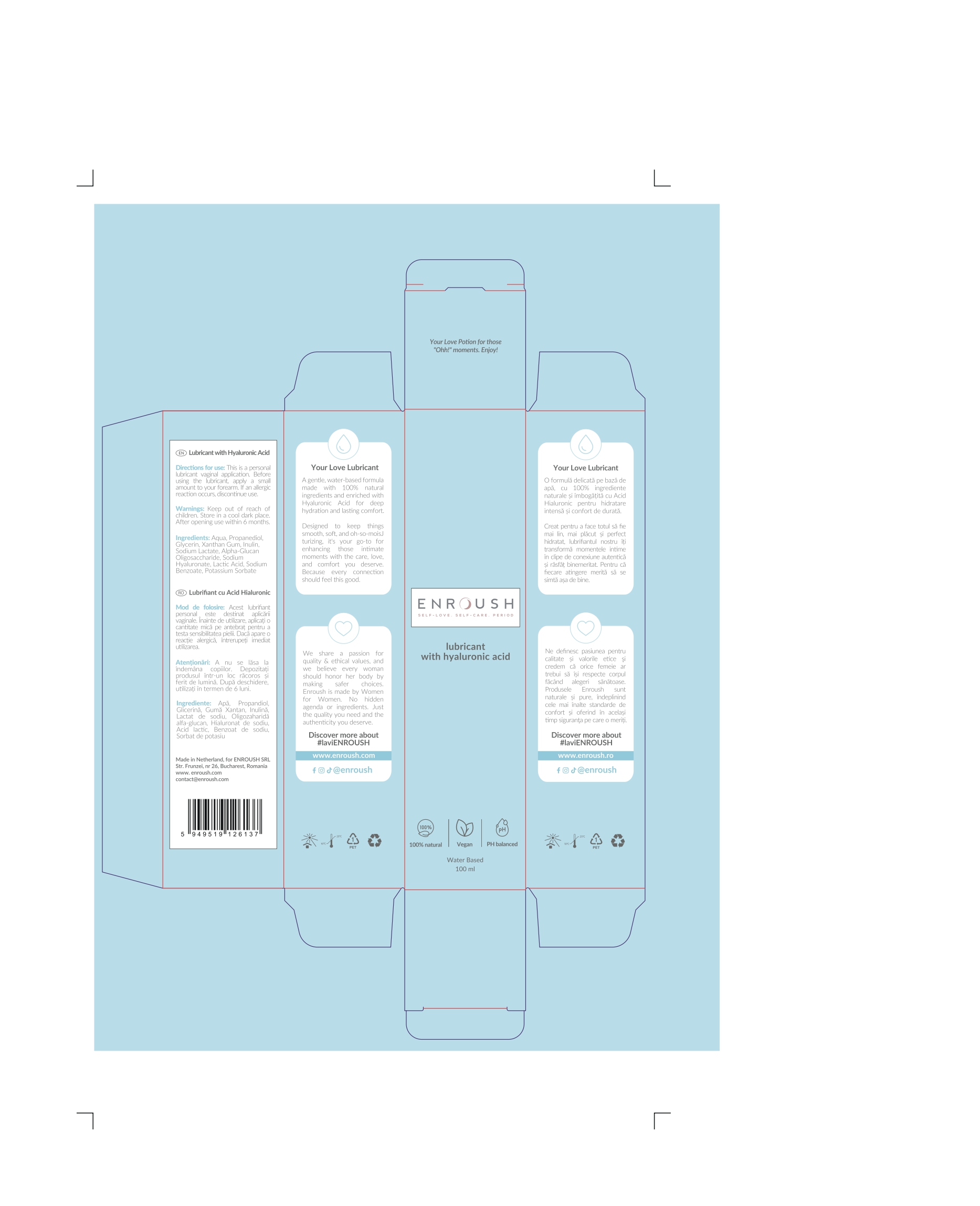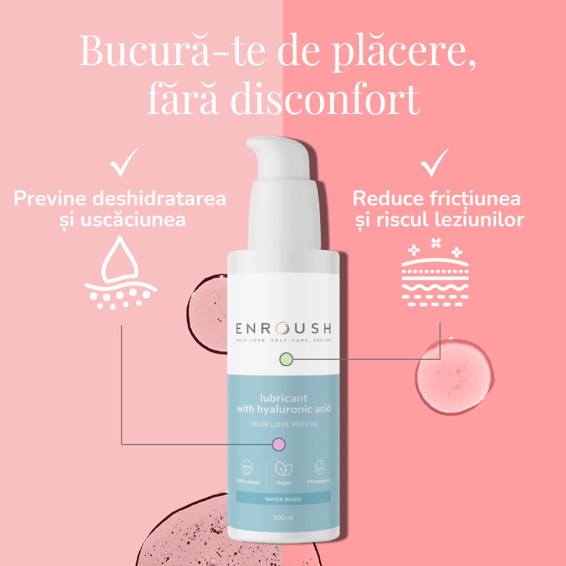 ENROUSH Gel Lubrifiant cu Acid Hialuronic este o formulă delicată, pe bază de apă, creată din 100% ingrediente naturale. Îmbogățit cu acid hialuronic, oferă hidratare intensă și de durată, reducând disconfortul și uscăciunea intimă. Textura sa catifelată transformă momentele intime în experiențe de conexiune autentică și plăcere, menținând echilibrul natural și senzația de prospețime.