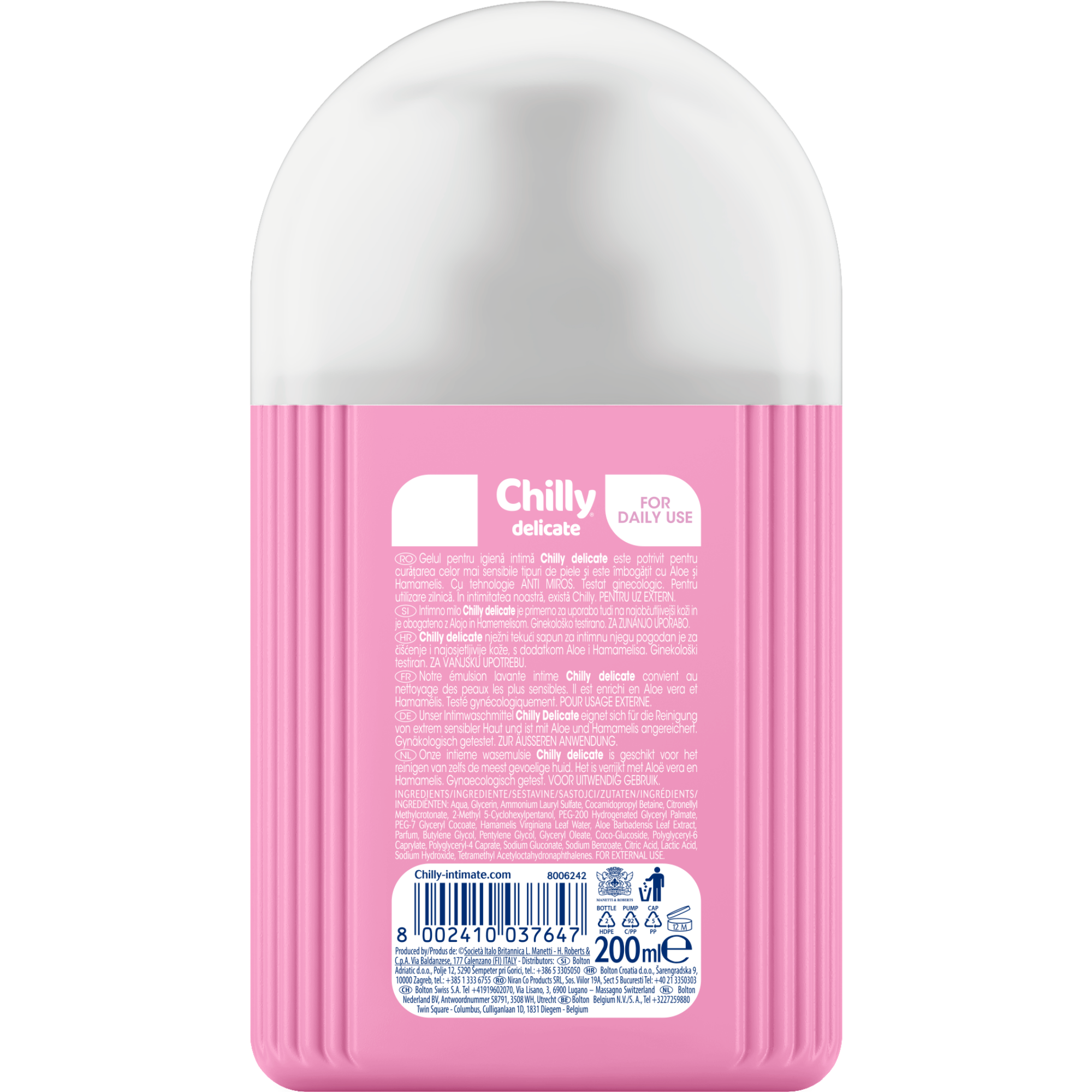 Chilly Delicate – gel pentru igiena intima pentru piele sensibila este special formulat pentru curatarea delicata a zonei intime, chiar si pentru cele mai sensibile tipuri de piele. Formula sa blanda, imbogatita cu aloe si hamamelis, ofera confort si ajuta la mentinerea echilibrului natural al pielii.