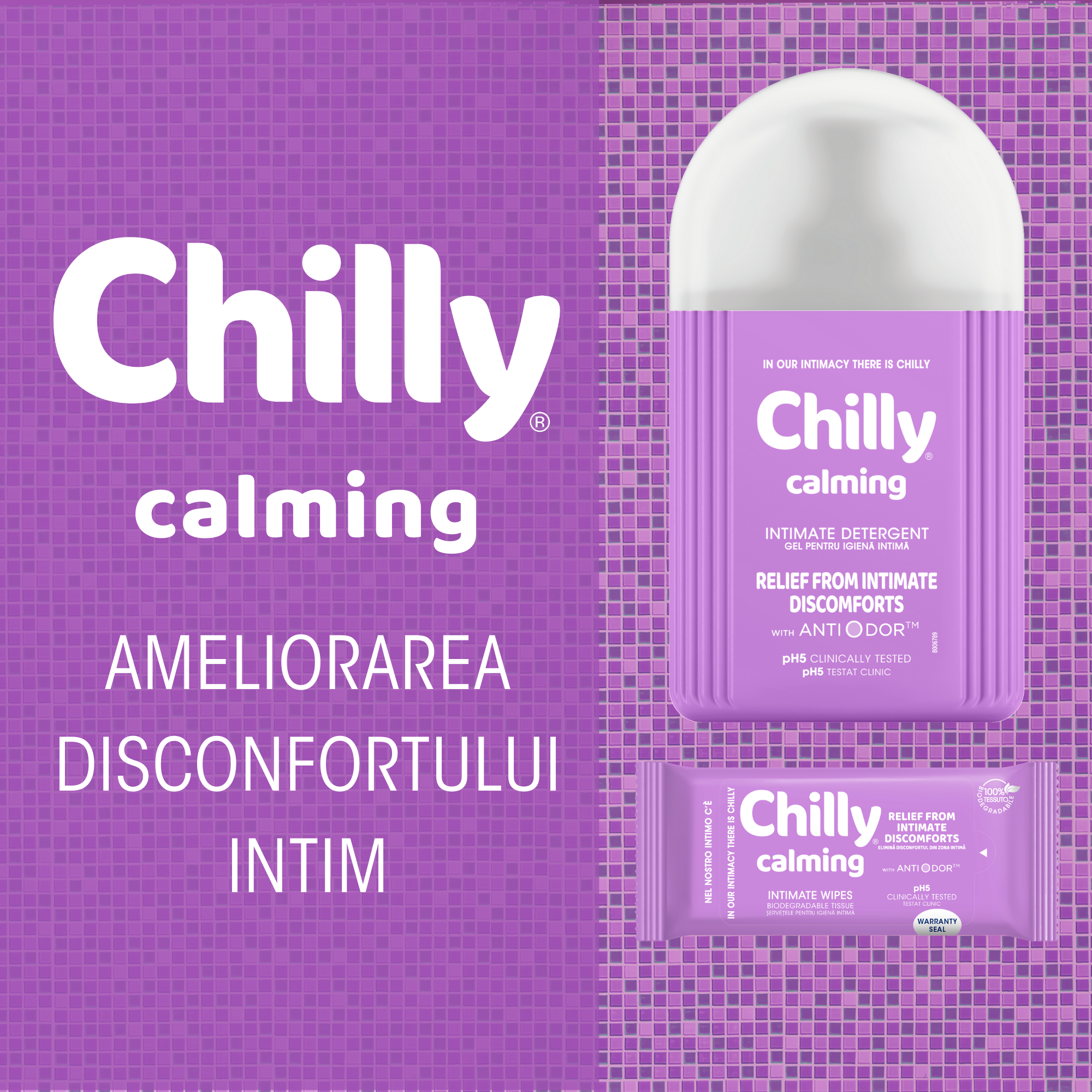 Chilly Calming sunt șervețele intime umede, ideale pentru uz zilnic și în deplasare, concepute pentru a calma disconfortul (arsuri, mâncărimi) și a oferi o senzație imediată de prospețime și protecție. Îmbogățite cu Bisabolol, un agent dermo-calmant natural, șervețelele respectă echilibrul delicat al pielii datorită pH-ului fiziologic 5. Fabricate din material 100% biodegradabil, sunt prietenoase atât cu pielea, cât și cu natura.