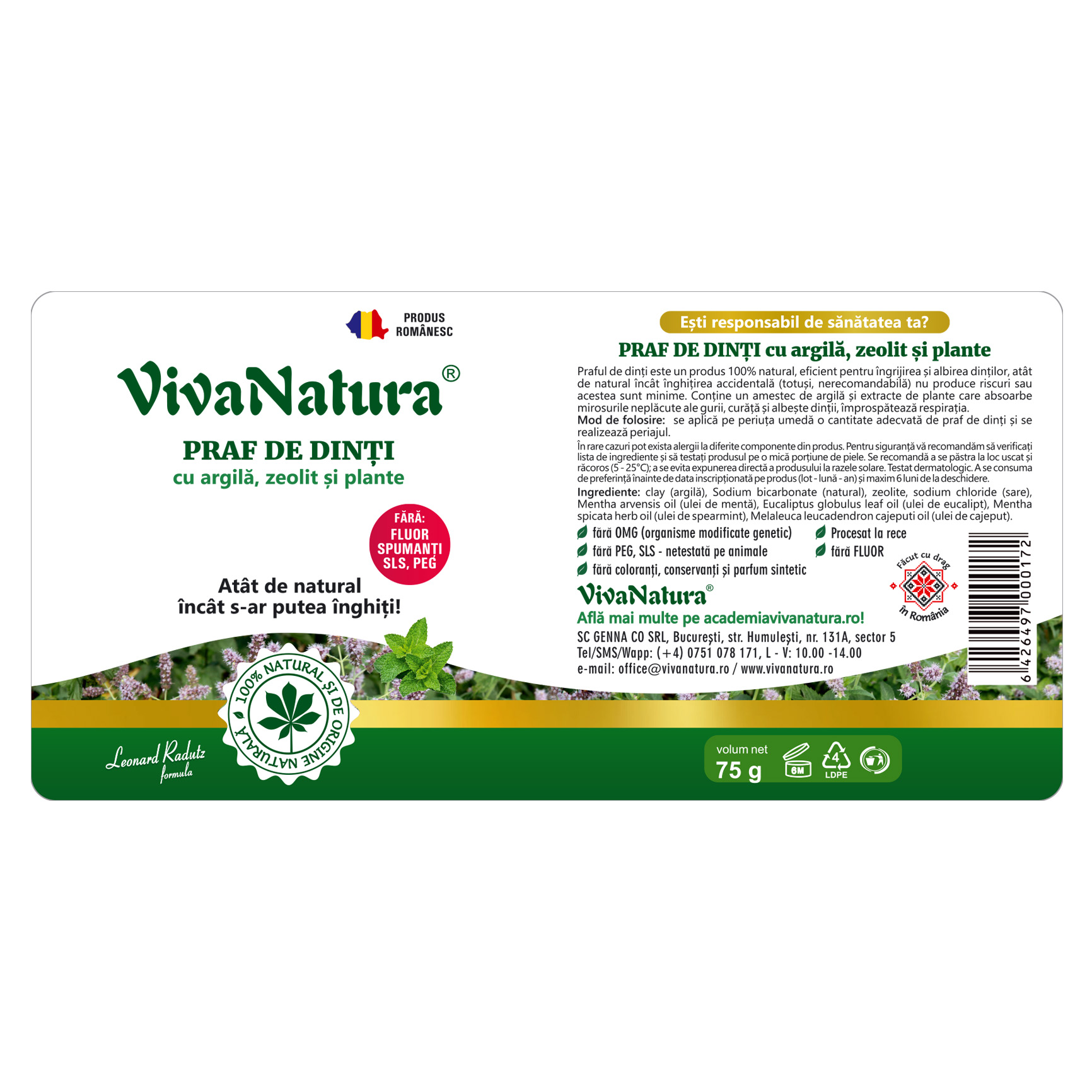 clay (argilă), Sodium bicarbonate (natural), zeolite, sodium chloride (sare), Mentha arvensis oil (ulei de mentă), Eucaliptus globulus leaf oil (ulei de eucalipt), Mentha spicata herb oil (ulei de spearmint), Melaleuca leucadendron cajeputi oil (ulei de cajeput).