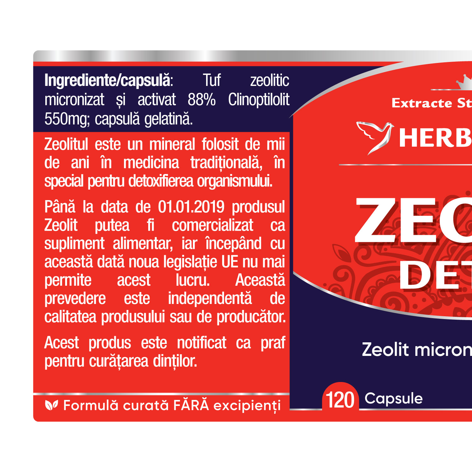 • Ingrediente/capsulă: Tuf zeolitic micronizat și activat 88% Clinoptilolit 550mg; capsulă gelatină.
