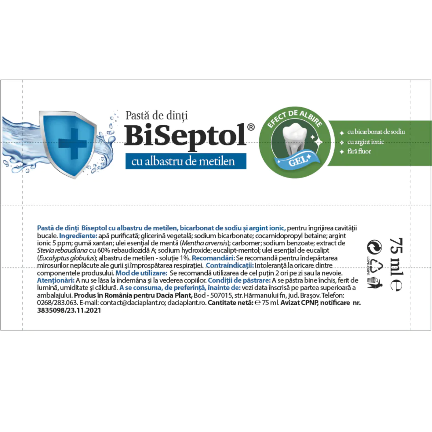 Pasta de dinți Biseptol oferă o îngrijire completă zilnică pentru dinți și gingii, curățând eficient plăca bacterială și prevenind apariția cariilor, în același timp pros-respirând respirația. Formula sa delicată include bicarbonat de sodiu cu efect ușor abraziv, ce îndepărtează petele și neutralizează aciditatea, precum şi argint ionic cu acțiune antibacteriană, totul fără conservanţi sau coloranţi. Folosiți-o de minimum două ori pe zi şi bucurați-vă de senzația de prospețime şi igienă pe termen lung.