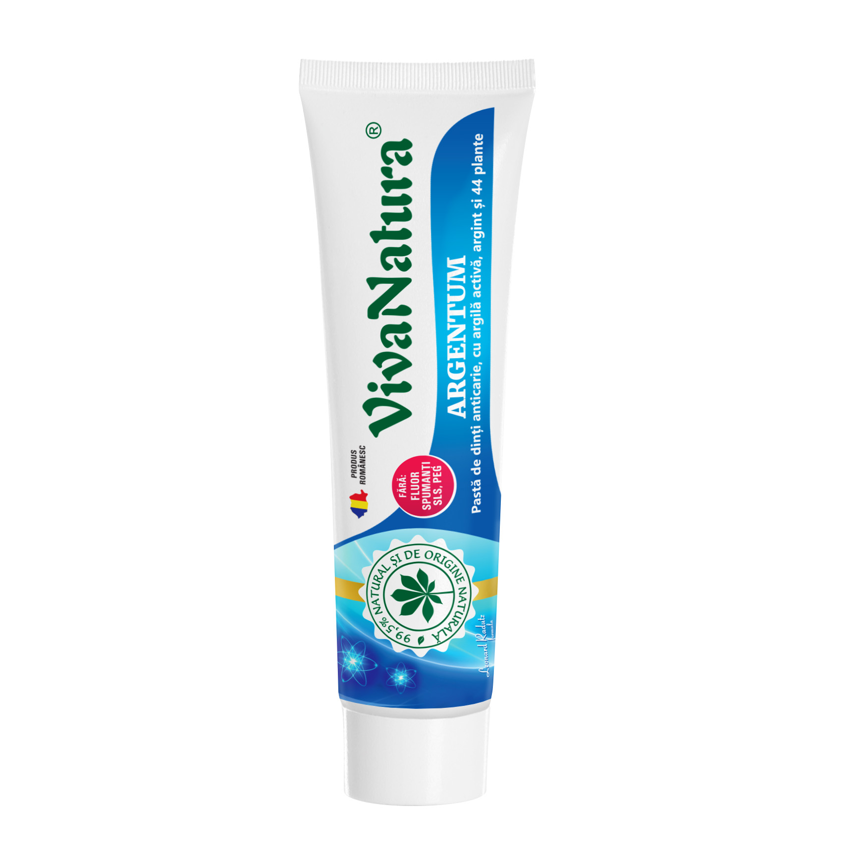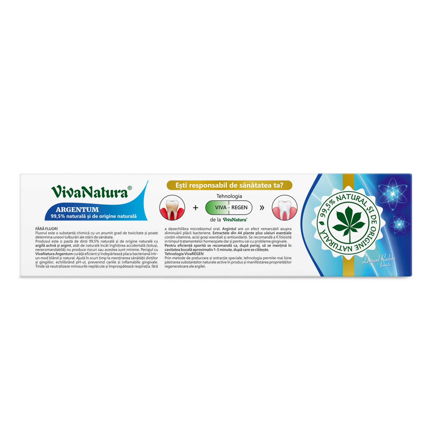 Produsul este o pastă de dinți 99,5% naturală şi de origine naturală cu argilă activă şi argint, atât de naturală încât înghițirea accidentală (totuşi, nerecomandabilă) nu produce riscuri sau acestea sunt minime. Periajul cu VivaNatura Argentum curăţă eficient şi îndepărtează placa bacteriană într- un mod blând şi natural. Ajută în scurt timp la menținerea sănătăţii dinţilor şi gingiilor, echilibrând pH-ul, prevenind cariile şi inflamațiile gingivale. Tinde să neutralizeze mirosurile neplăcute şi împrospătează respiraţia, fără a dezechilibra microbiomul oral. Argintul are un efect remarcabil asupra diminuării plăcii bacteriene. Extractele din 44 plante plus uleiuri esenţiale conţin vitamine, acizi graşi esențiali și antioxidanţi. Se recomandă a fi folosită in timpul tratamentelor homeopate dar şi pentru cei cu probleme gingivale. Pentru eficiență sporită se recomandă ca, după periaj, să se menţină în cavitatea bucală aproximativ 1-3 minute, după care se clăteşte.