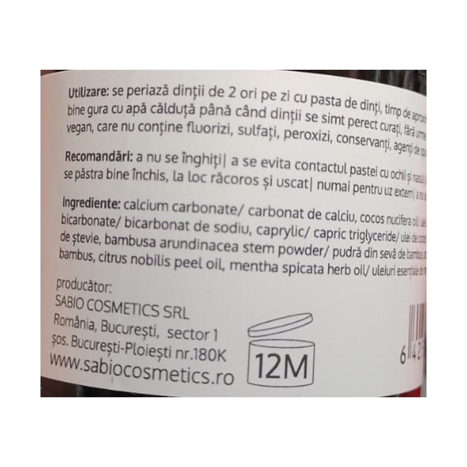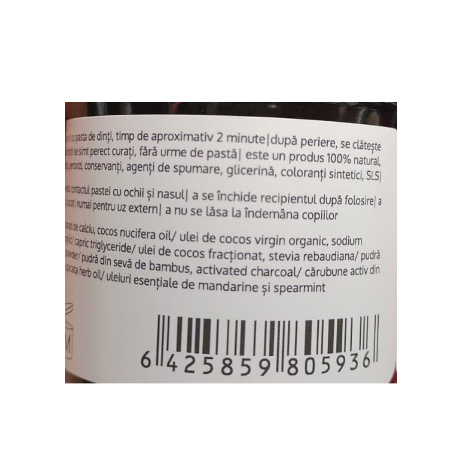 calcium carbonate/carbonat de calciu, cocos nucifera oil/ulei de cocos virgin organic, sodium bicarbonate/bicarbonat de sodiu, caprylic/capric triglyceride/ulei de cocos fracționat, stevia rebaudiana/pudră de ştevie, bambusa arundinacea stem powder/pudră din sevă de bambus, activated charcoal/carbune activ din bambus, citrus nobilis peel oil, mentha spicata herb oil/ uleiuri esenţiale de mandarine şi spearmint.