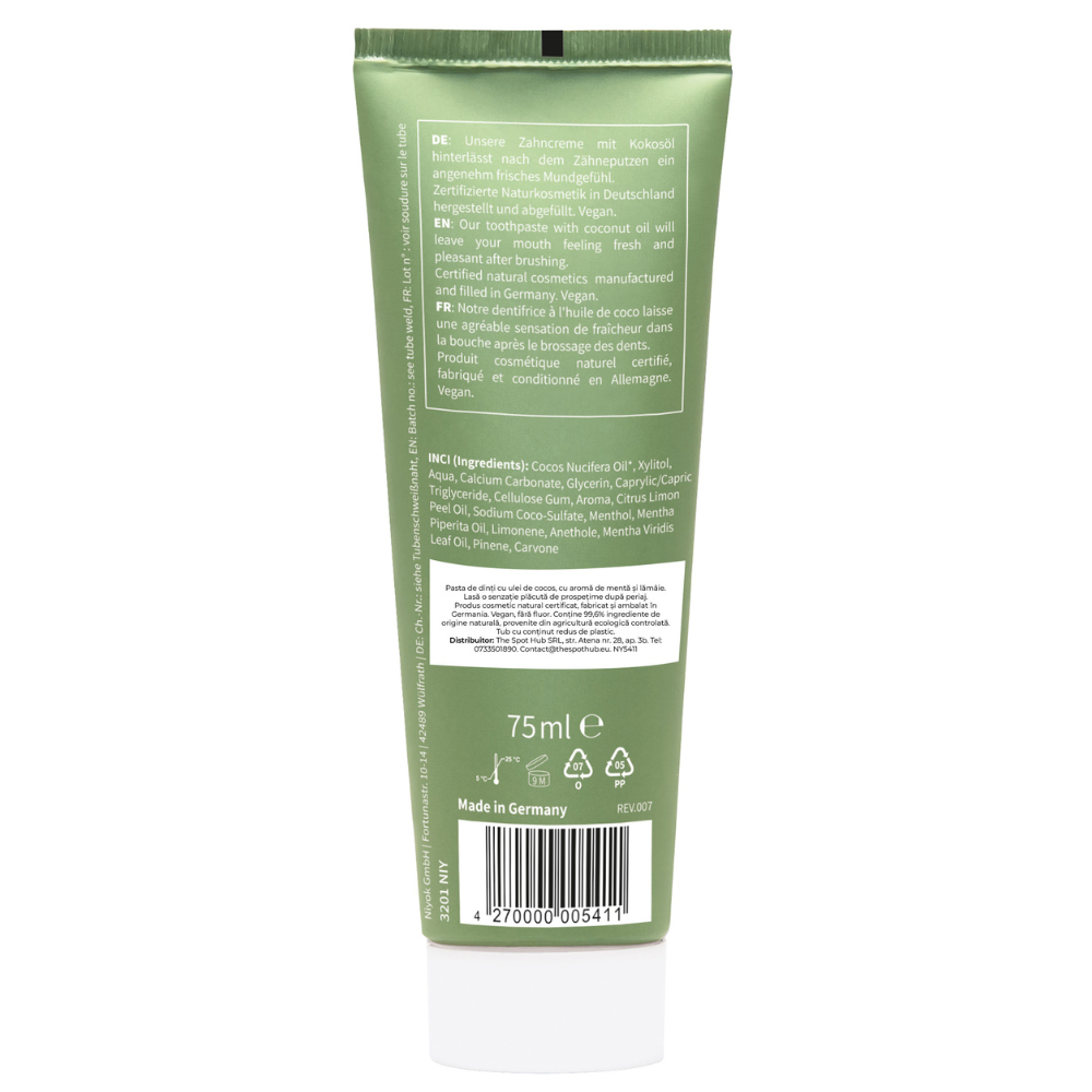 Pasta de dinți Niyok cu ulei de cocos organic, mentă și lămâie oferă o curățare eficientă și blândă, fiind potrivită pentru utilizarea zilnică. Formula sa naturală susține igiena orală și sănătatea gingiilor, contribuind la menținerea echilibrului microbiomului oral.