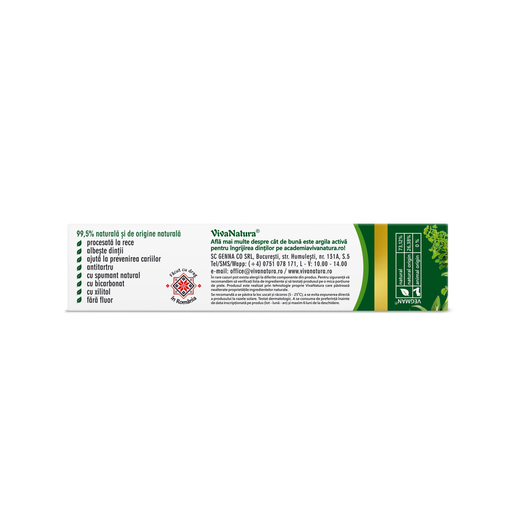 Clay (argilă), Aqua, Sodium bicarbonate (bicarbonat de sodiu), Glycerine (origine naturală), Xylitol (origine naturală), Sodium Myrystoil Glutamate (origine naturală), Alcohol (origine naturală), Menthol (natural), Pimpinella anisum oil (ulei de anason), Xanthan gum (origine naturală), Zinc PCA (origine naturală), Glyceryl laurate (origine naturală), 75 810 (colorant verde spanac), Sodium Benzoate, Salvia sclaerea oil (ulei de salvie), Potassium Sorbate, Citric Acid, Thymus vulgaris flower/leaf oil (ulei cimbru), Propolis Extract, Aloe vera callus extract (aloe), Anethole, Beta-Caryophyllene, d-l d-Limonene, Geranyl Acetate, Linalool, Linalyl Acetate, Menthol, Terpineol, Oreganum vulgare Leaf Oil (ulei oregano), Thymus serpillum extract (cimbrișor), Glycyrrhiza glabra extract (lemn dulce), Cinnamomum cassia extract (scorţişoară), Eugenia caryophillus extract (cuişoare), Salvia officinalis (salvie), Achillea millefolium (coada şoricelului), Ocimum basilicum herb extract (busuioc), Melissa officinalis extract (roiniță), Plantago lanceolata leaf extract (pătlagină), Artemisia
