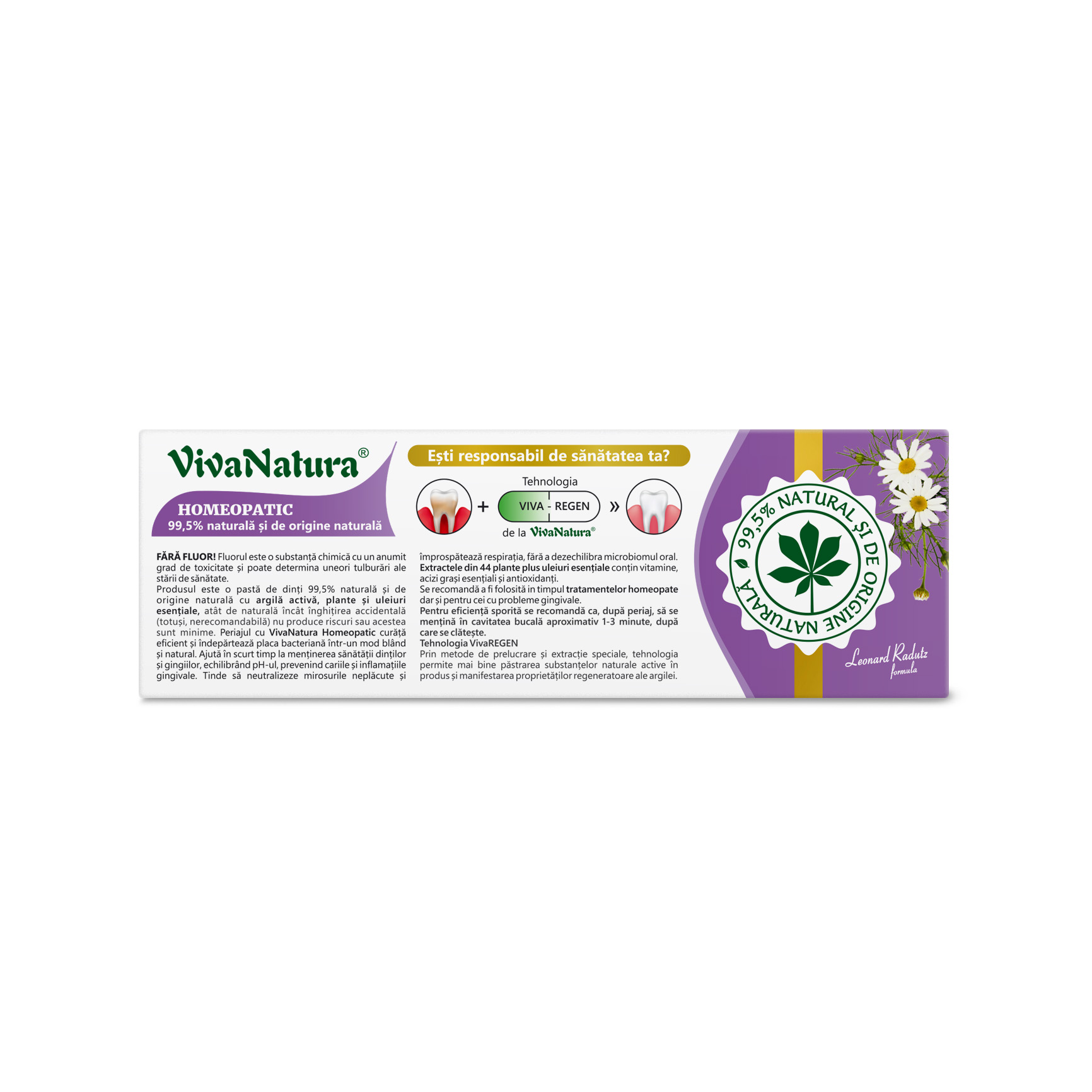 Produsul este o pastă de dinți 99,5% naturală şi de origine naturală cu argilă activă, plante şi uleiuri esențiale, atât de naturală încât înghițirea accidentală (totuşi, nerecomandabilă) nu produce riscuri sau acestea sunt minime. Periajul cu VivaNatura Homeopatic curăţă eficient şi îndepărtează placa bacteriană într-un mod blând şi natural. Ajută în scurt timp la menţinerea sănătăţii dinţilor şi gingiilor, echilibrând pH-ul, prevenind cariile şi inflamațiile gingivale. Tinde să neutralizeze mirosurile neplăcute şi împrospătează respiraţia, fără a dezechilibra microbiomul oral. Extractele din 44 plante plus uleiuri esențiale conţin vitamine, acizi graşi esenţiali şi antioxidanţi.