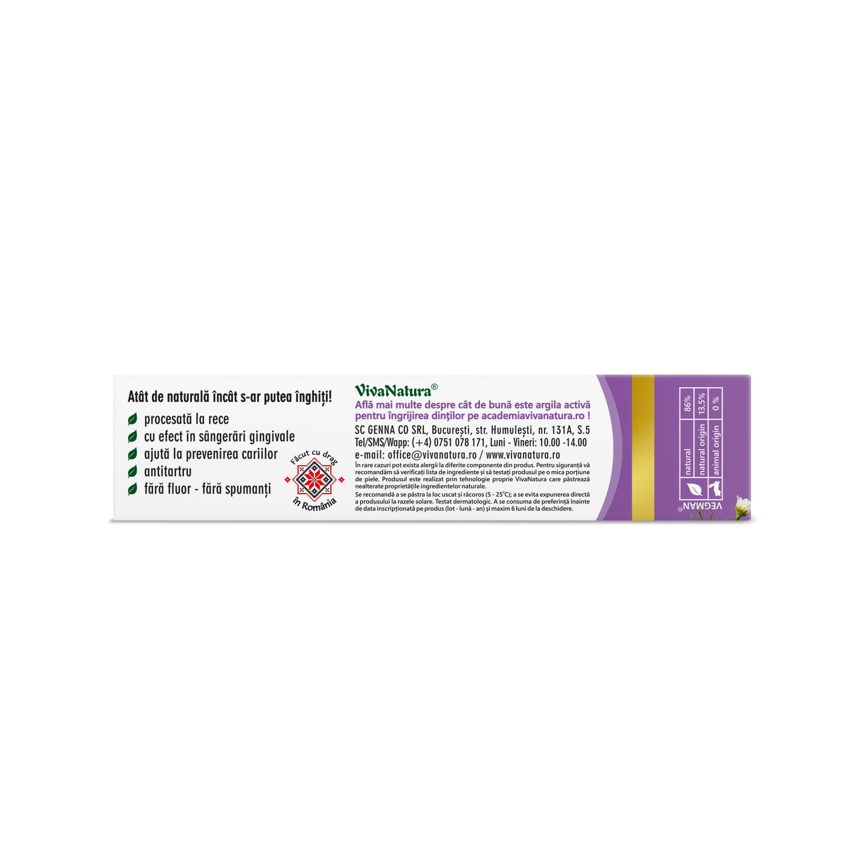 Produsul este realizat prin tehnologie proprie VivaNatura care păstrează nealterate proprietățile ingredientelor naturale.