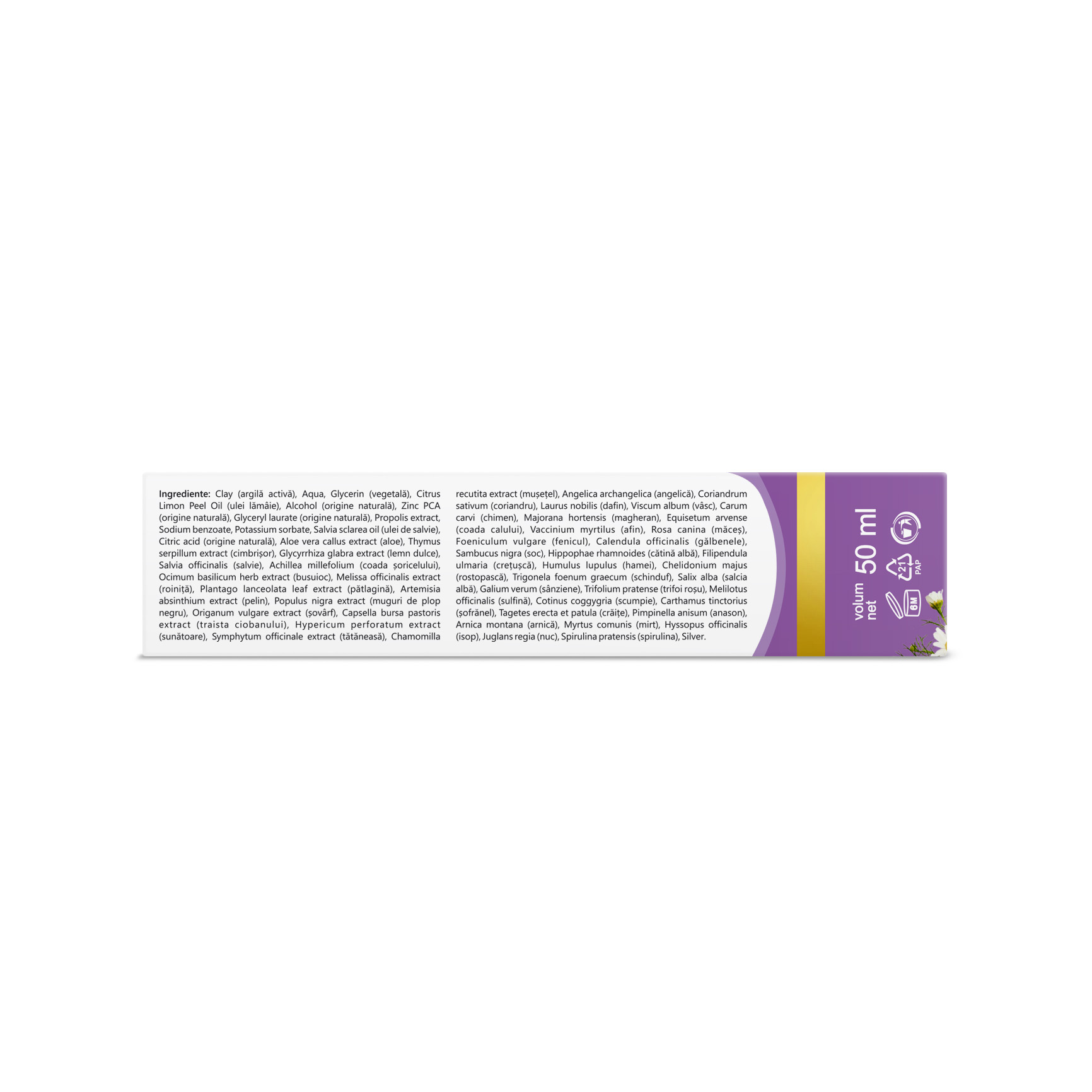 Clay (argilă activă), Aqua, Glycerin (vegetală), Citrus Limon Peel Oil (ulei lămâie), Alcohol (origine naturală), Zinc PCA (origine naturală), Glyceryl laurate (origine naturală), Propolis extract, Sodium benzoate, Potassium sorbate, Salvia sclarea oil (ulei de salvie), Citric acid (origine naturală), Aloe vera callus extract (aloe), Thymus serpillum extract (cimbrișor), Glycyrrhiza glabra extract (lemn dulce), Salvia officinalis (salvie), Achillea millefolium (coada şoricelului), Ocimum basilicum herb extract (busuioc), Melissa officinalis extract (roiniță), Plantago lanceolata leaf extract (pătlagină), Artemisia absinthium extract (pelin), Populus nigra extract (muguri de plop negru), Origanum vulgare extract (sovârf), Capsella bursa pastoris extract (traista ciobanului), Hypericum perforatum extract (sunătoare), Symphytum officinale extract (tǎtǎneasă), Chamomilla recutita extract (muşeţel), Angelica archangelica (angelică), Coriandrum sativum (coriandru), Laurus nobilis (dafin), Viscum album (vâsc), Carum carvi (chimen), Majorana hortensis (magheran), Equisetum arvense (coada calului), Vaccinium myrtilus (afin), Rosa canina (măceş), Foeniculum vulgare (fenicul), Calendula officinalis (gălbenele), Sambucus nigra (soc), Hippophae rhamnoides (cătină albă), Filipendula ulmaria (creţuşcă), Humulus lupulus (hamei), Chelidonium majus (rostopască), Trigonela foenum graecum (schinduf), Salix alba (salcia albă), Galium verum (sânziene), Trifolium pratense (trifoi roşu), Melilotus officinalis (sulfină), Cotinus coggygria (scumpie), Carthamus tinctorius (sofrǎnel), Tagetes erecta et patula (crăiţe), Pimpinella anisum (anason), Arnica montana (arnică), Myrtus comunis (mirt), Hyssopus officinalis (isop), Juglans regia (nuc), Spirulina pratensis (spirulina), Silver.
