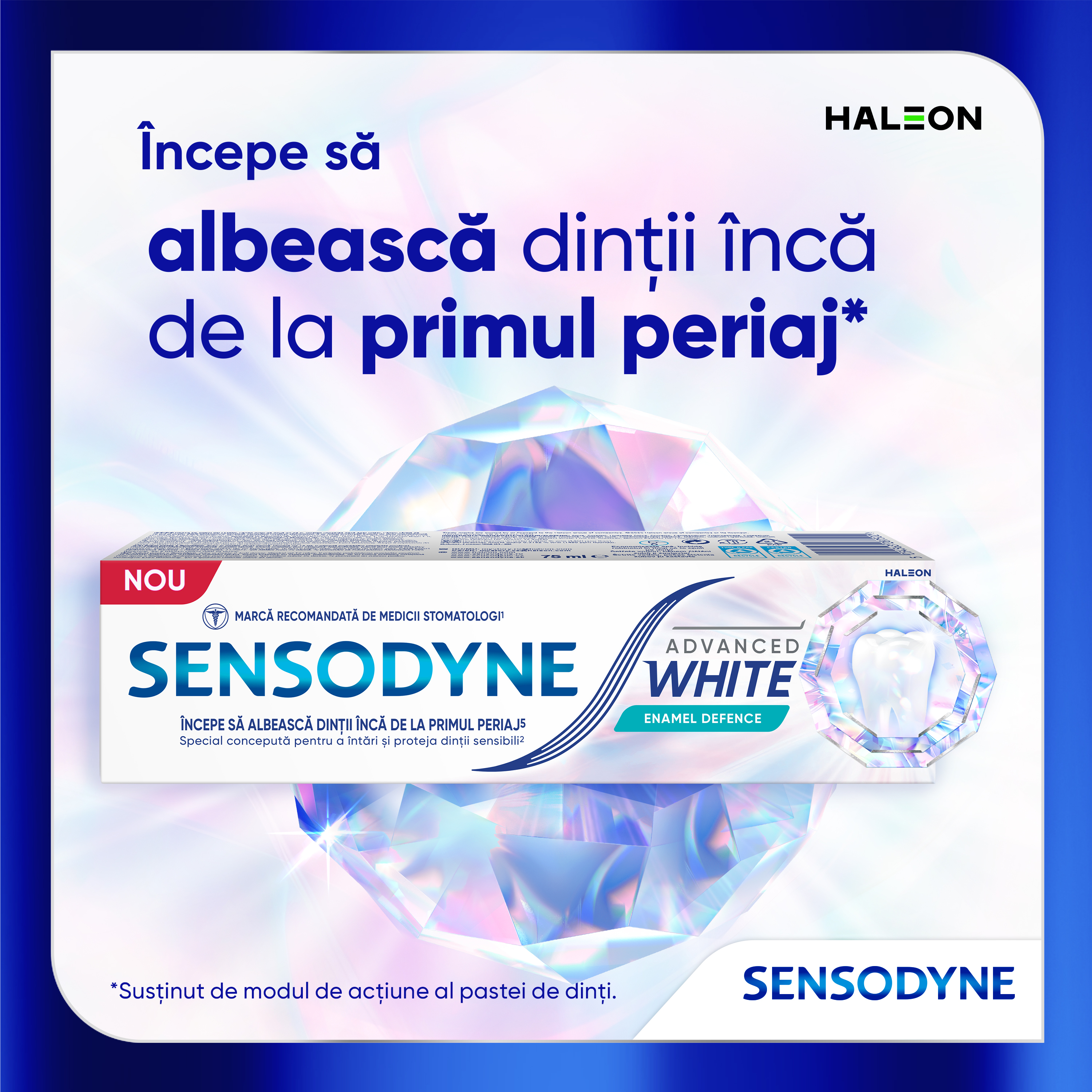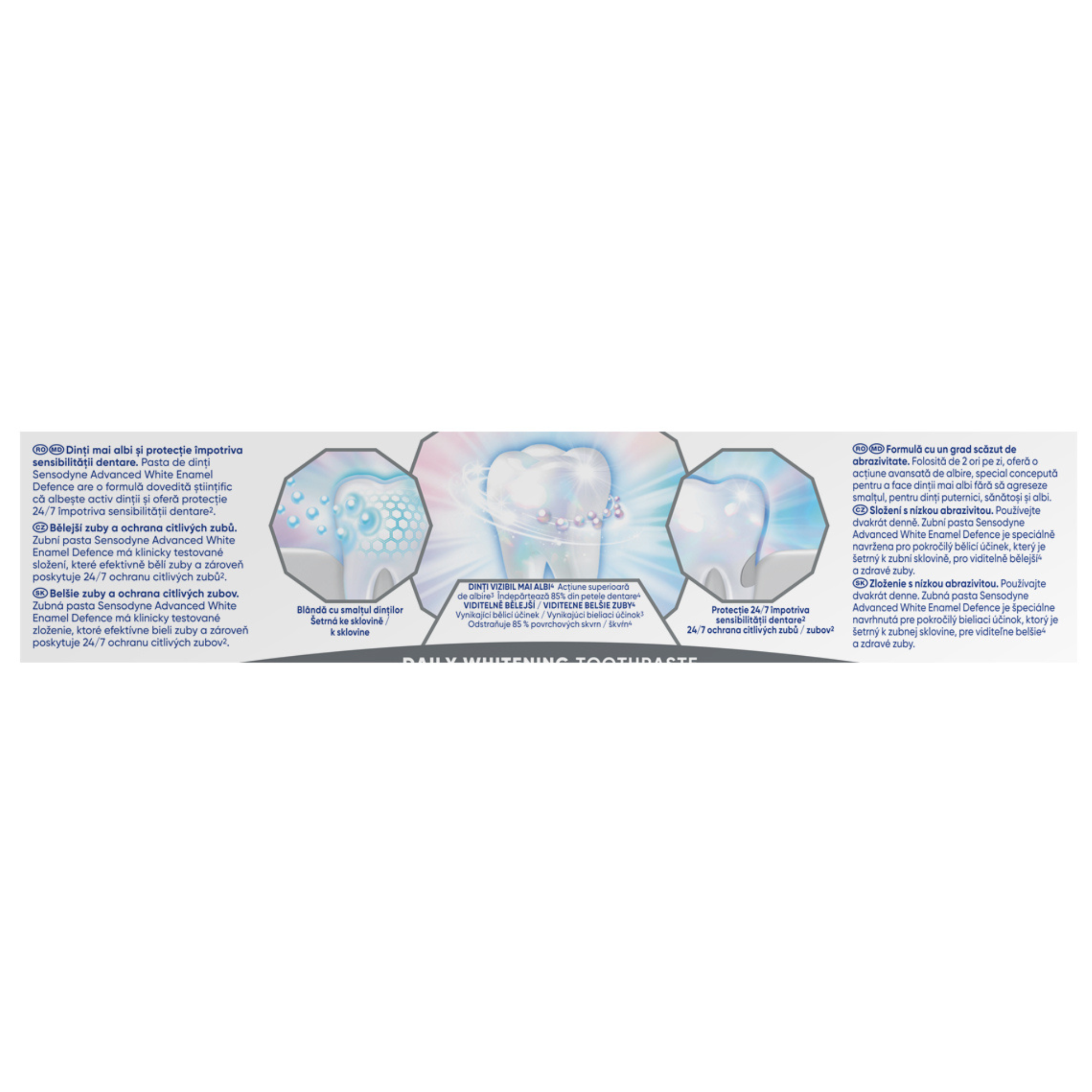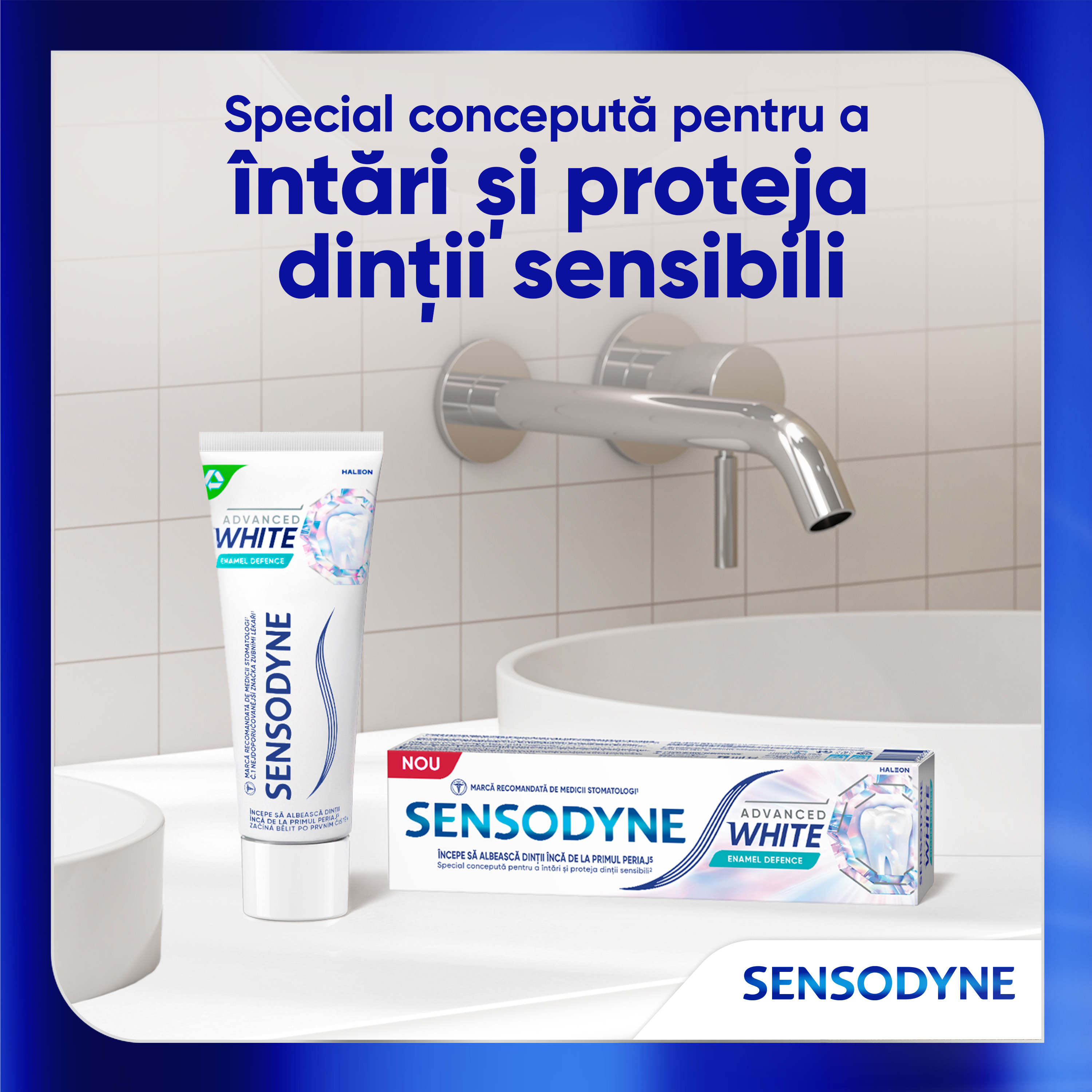 Sensodyne Advanced White Enamel Defence este o pasta de dinti special formulata pentru dintii sensibili, care ofera protectie impotriva sensibilitatii si actiune eficienta de albire. Formula cu fluor si abrazivitate scazuta ajuta la indepartarea petelor si protejarea smaltului, pentru dinti mai albi si mai sanatosi.