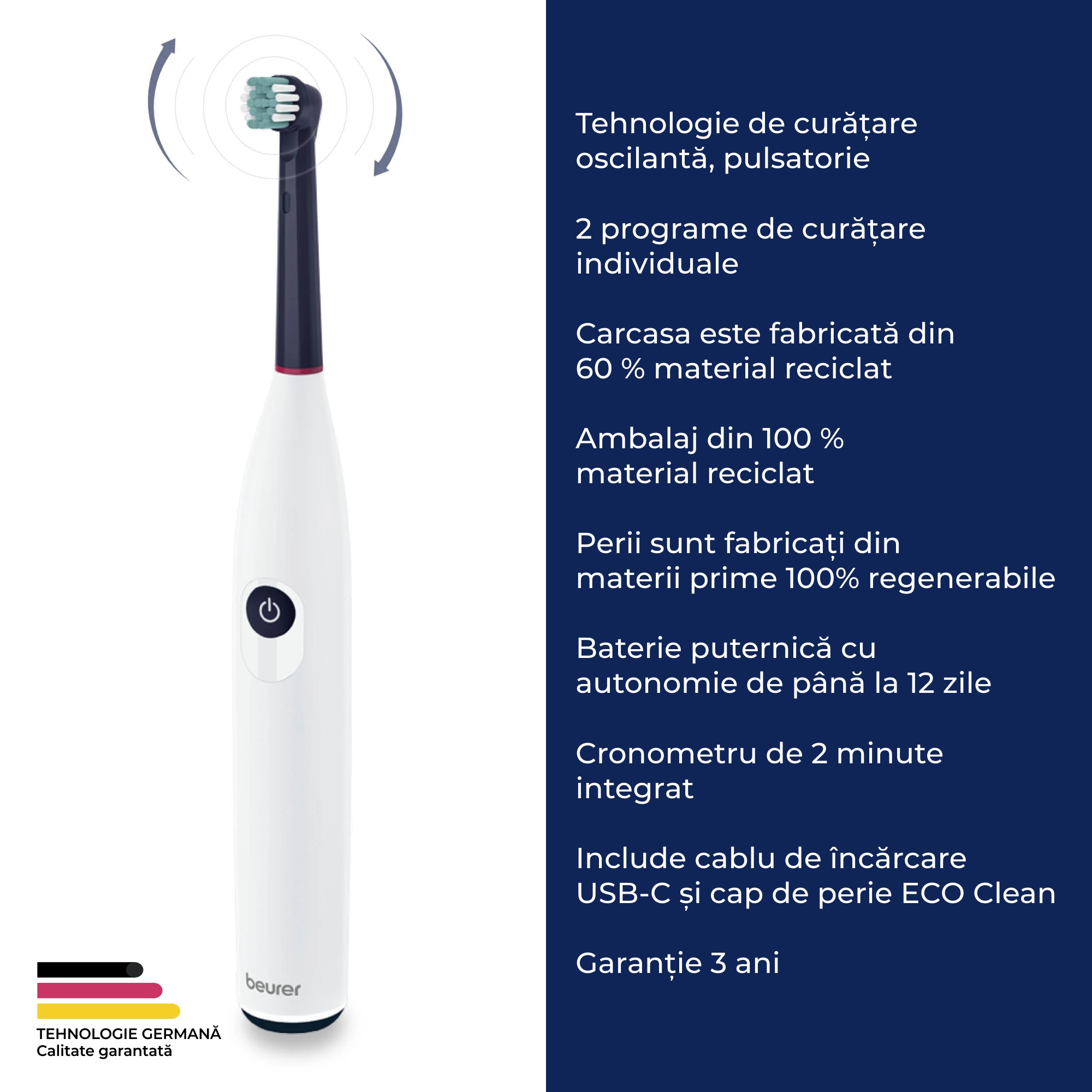 Descoperă Beurer TB 15 Green Planet, periuța de dinți electrică ce combină performanța profesională cu grija față de mediu. Cu o tehnologie oscilantă și pulsatorie testată clinic, periuța asigură o curățare profundă și delicată a dinților, îndepărtând eficient placa bacteriană. Construită din materiale reciclate (60%) și materii prime regenerabile (100%), TB 15 este alegerea ideală pentru o igienă orală superioară, sustenabilă și modernă. Cu două programe de curățare (Clean și Sensitive), cronometru integrat de 2 minute și autonomie de până la 12 zile, această periuță oferă performanță inteligentă și confort zilnic.