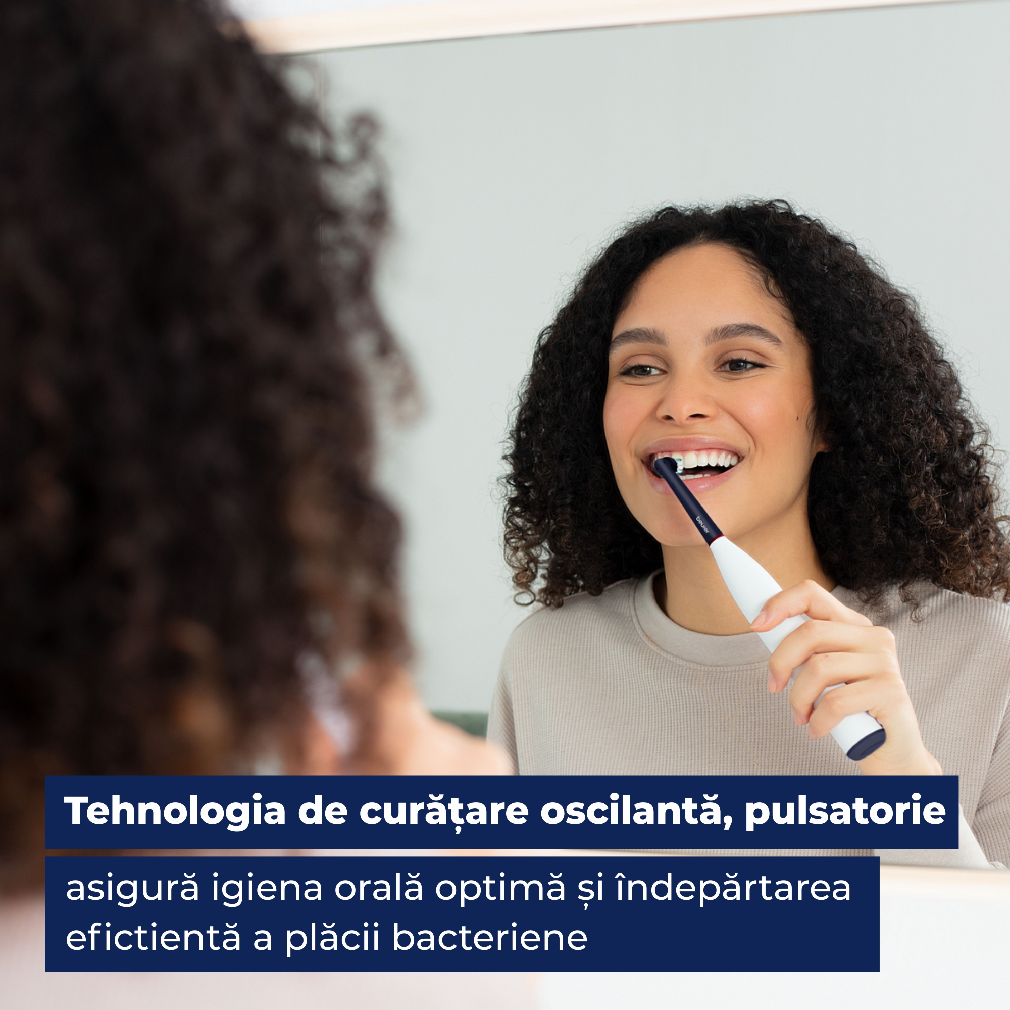 - Curățare profesională – Tehnologia oscilantă și pulsatorie îndepărtează eficient placa bacteriană, pentru o igienă orală optimă.