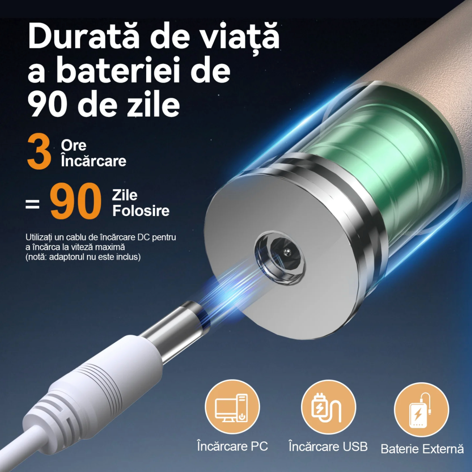 - Încărcare USB – compatibilă cu PC, baterii externe sau adaptoare.
