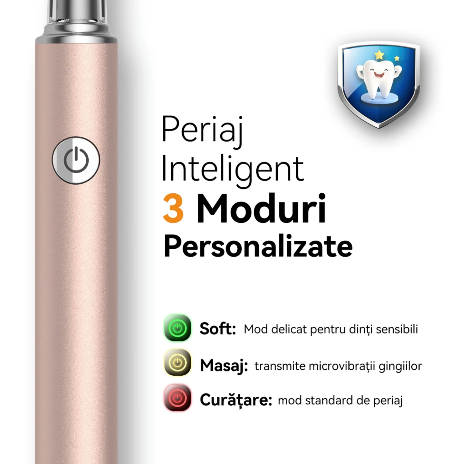 - Ajută la o experiență de periaj confortabilă datorită celor 3 moduri inteligente.