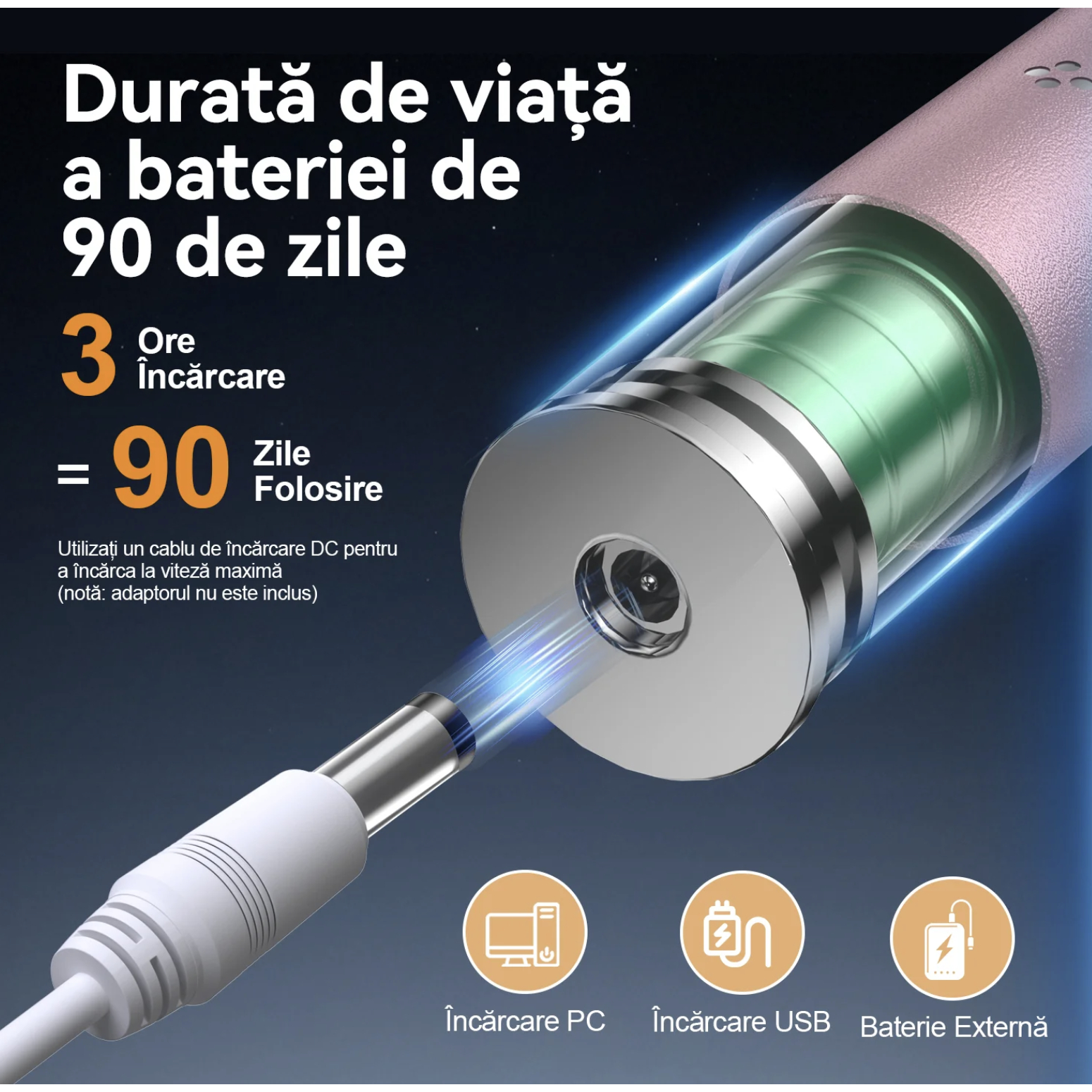 Încărcare rapidă în 3 ore prin cablu USB (compatibil cu PC, power bank sau adaptor).