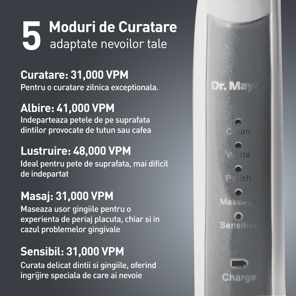 Tehnologia noastra cu vibratii sonice este intotdeauna cu un pas inainte. Cele 31.000 pana la 48.000 de vibratii sonice puternice va ofera ingrijire dentara completa si reduce foarte mult timpul de ingrijire dentara.