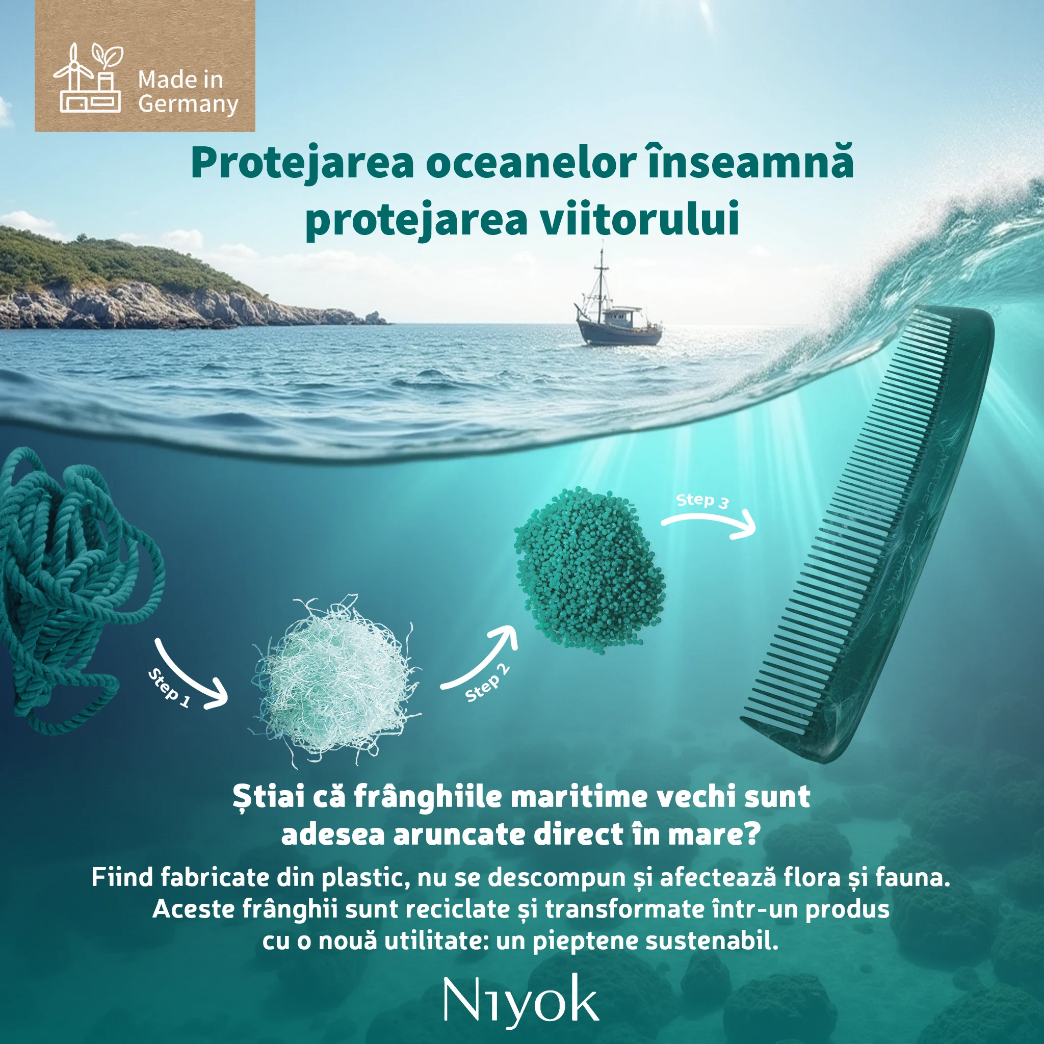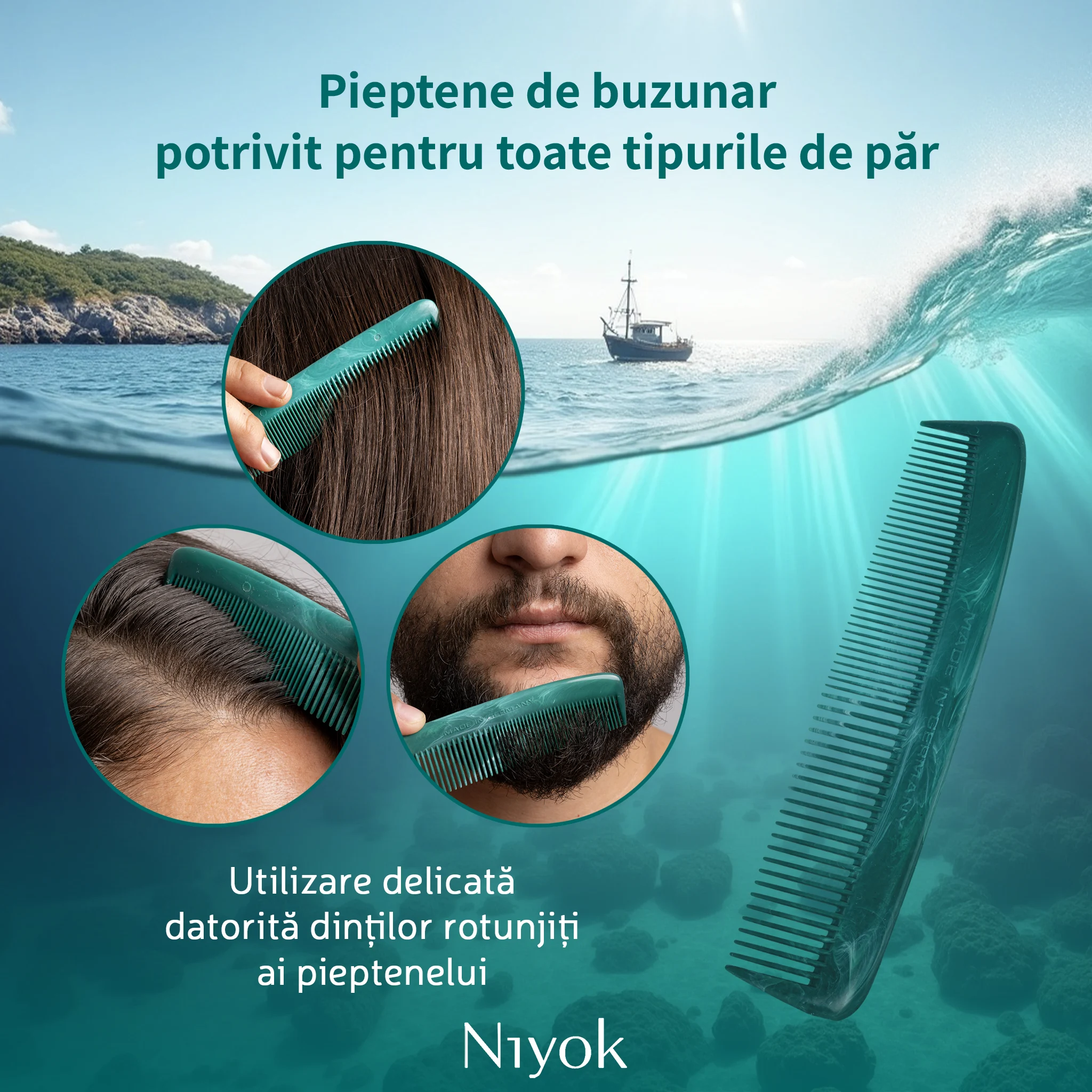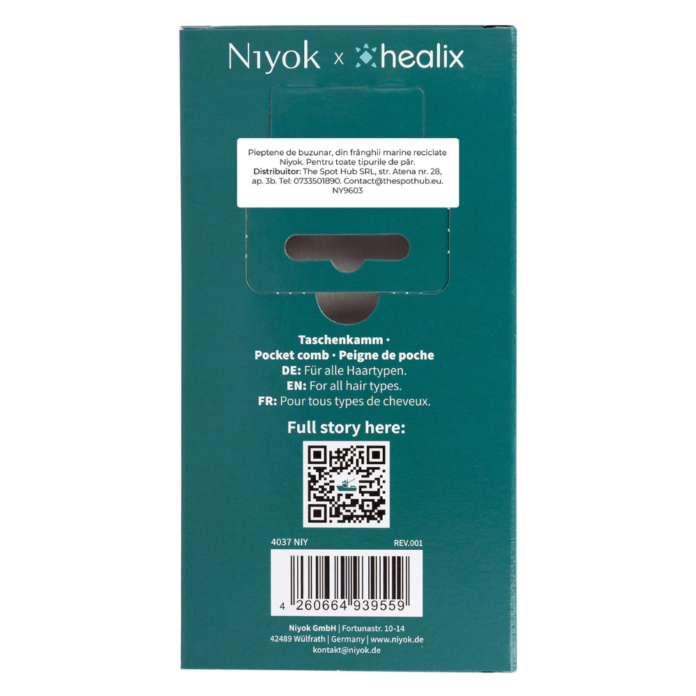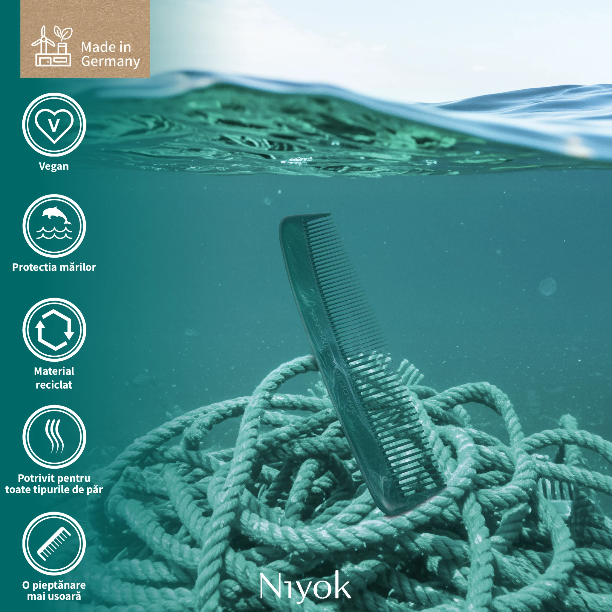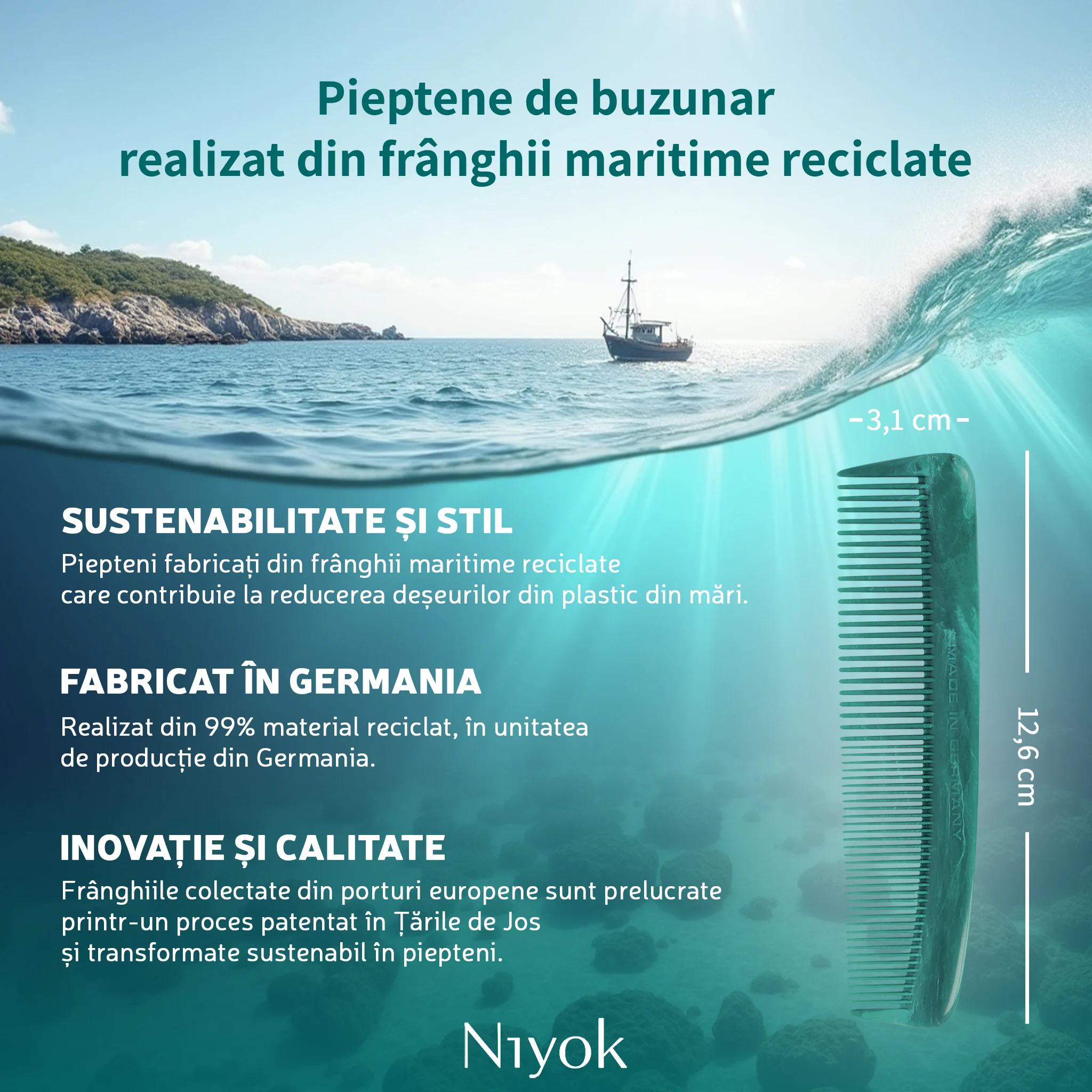 Pieptanul de buzunar Niyok pentru retus rapid si pieptanare zilnica este un accesoriu compact, durabil si sustenabil, ideal pentru ingrijirea parului oriunde te afli. Realizat in Germania din 99% franghii maritime reciclate, acest pieptan este rezultatul colaborarii Niyok x Healix, un proiect european care transforma deseurile maritime in materiale premium, complet trasabile. Designul minimalist, dimensiunea ultra-portabila si dintii fini il fac perfect pentru retusuri rapide, netezirea suvitelor si pieptanare delicata, fara electrizare sau disconfort.