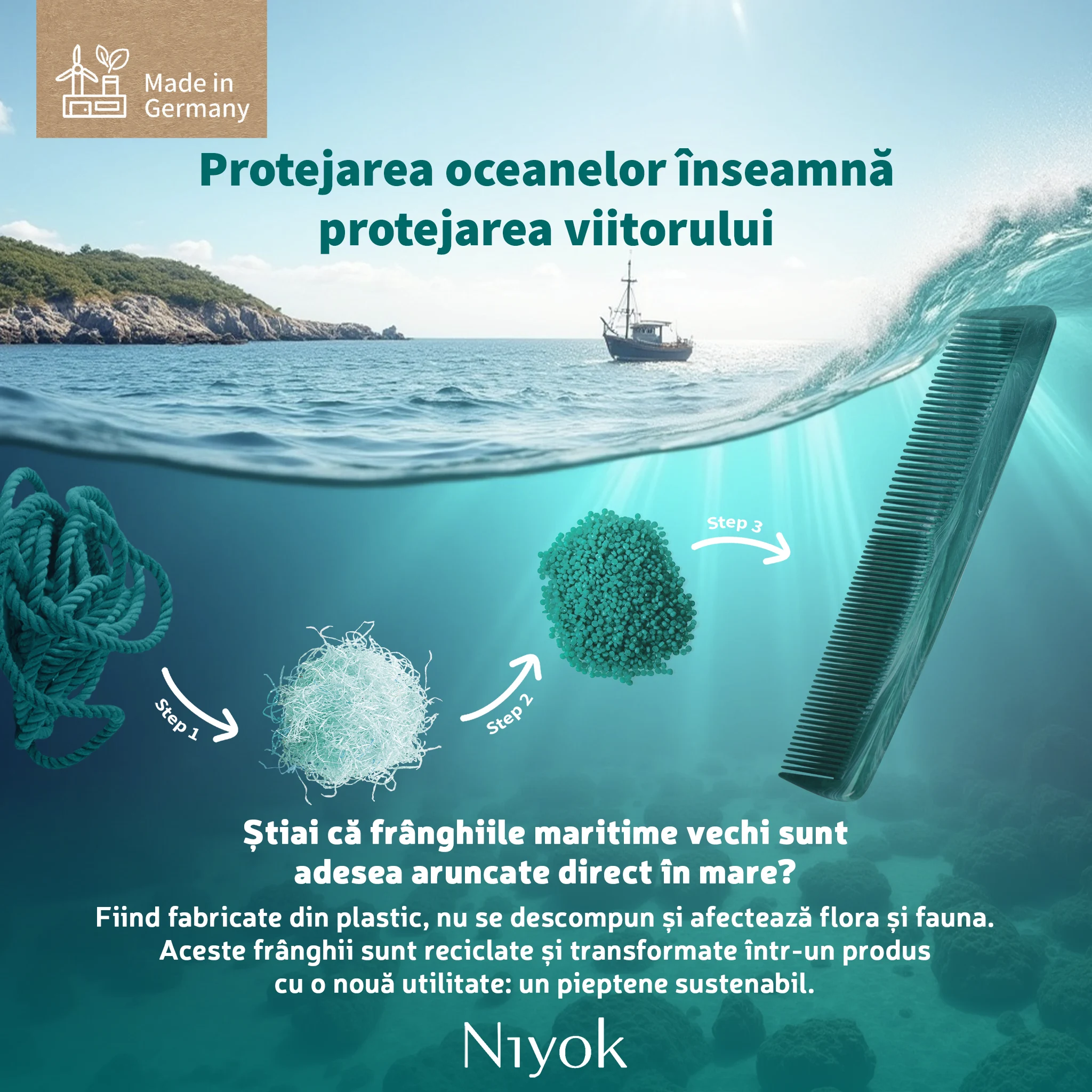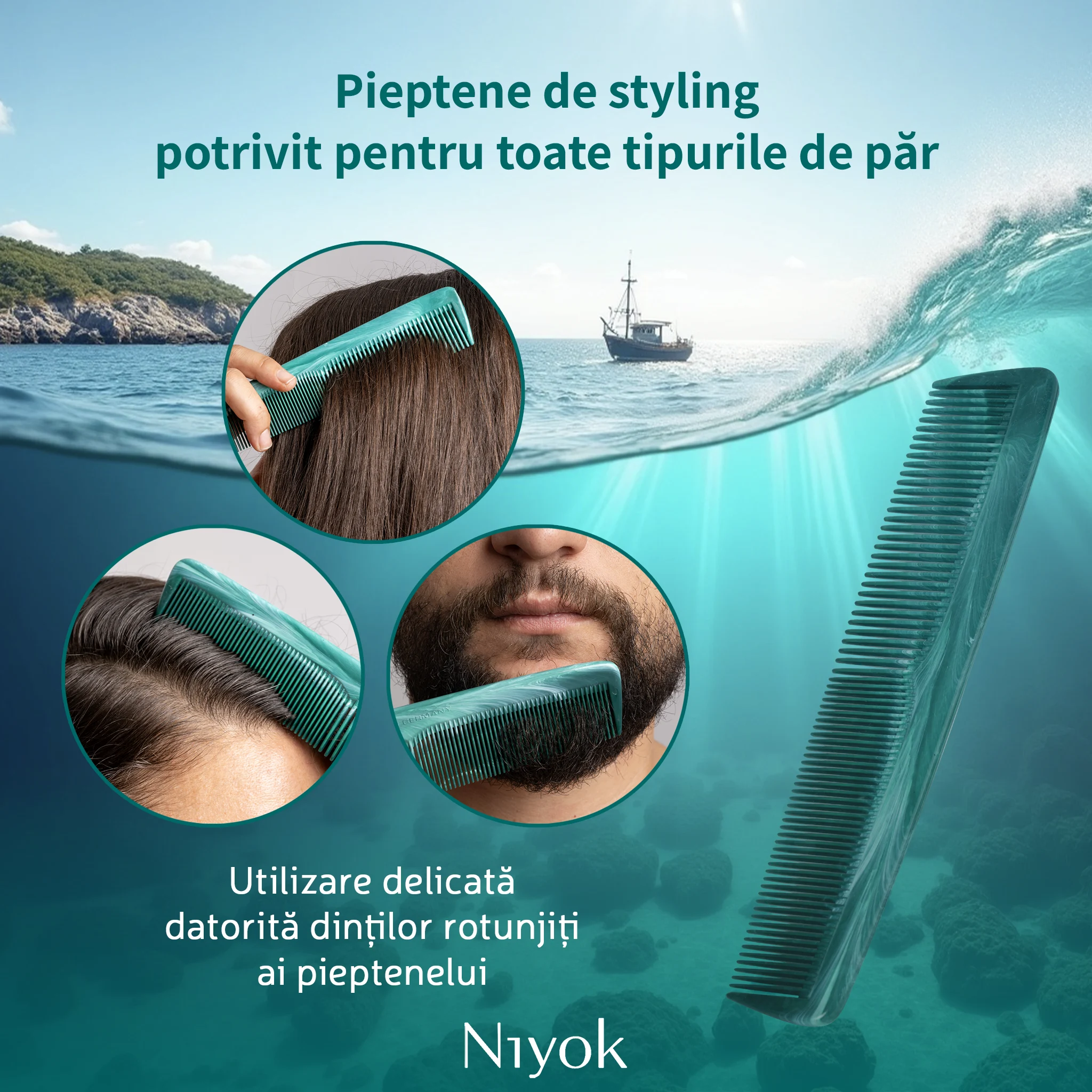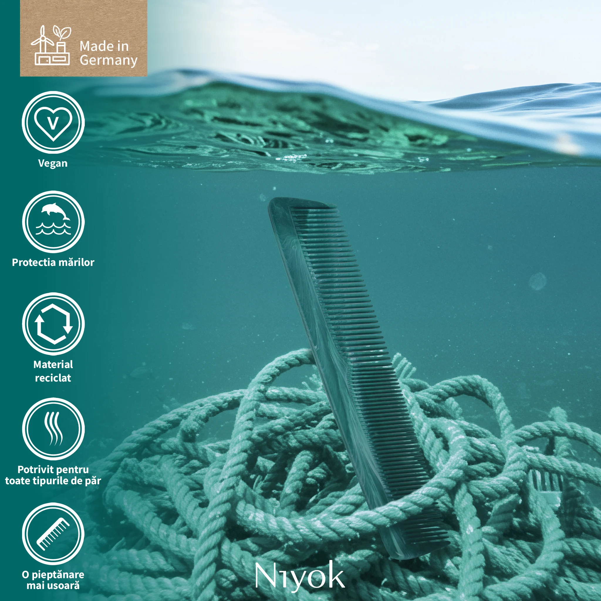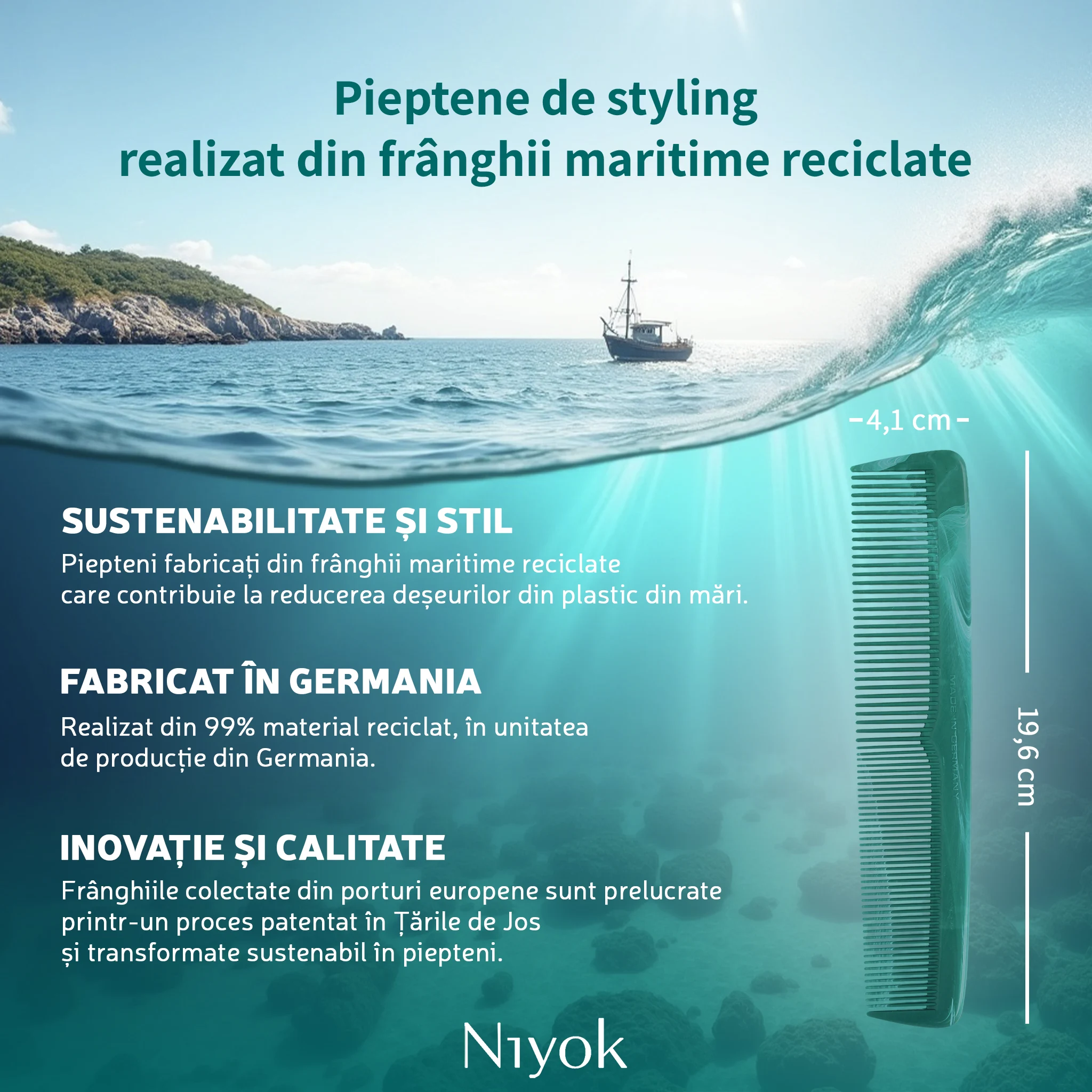 Pieptanul de styling Niyok pentru precizie si finisare naturala este un instrument profesional conceput pentru aranjarea controlata a parului, definirea coafurilor si obtinerea unor finisaje curate, naturale. Fabricat in Germania din 99% franghii maritime reciclate, acest pieptan reprezinta rezultatul colaborarii dintre Niyok si Healix, lider european in reciclarea responsabila a franghiilor maritime uzate. Designul sau precis, cu dinti fermi si aliniati uniform, permite separarea suvitelor, trasarea liniilor curate si controlul firelor rebele, fiind potrivit atat pentru uz personal, cat si profesional.