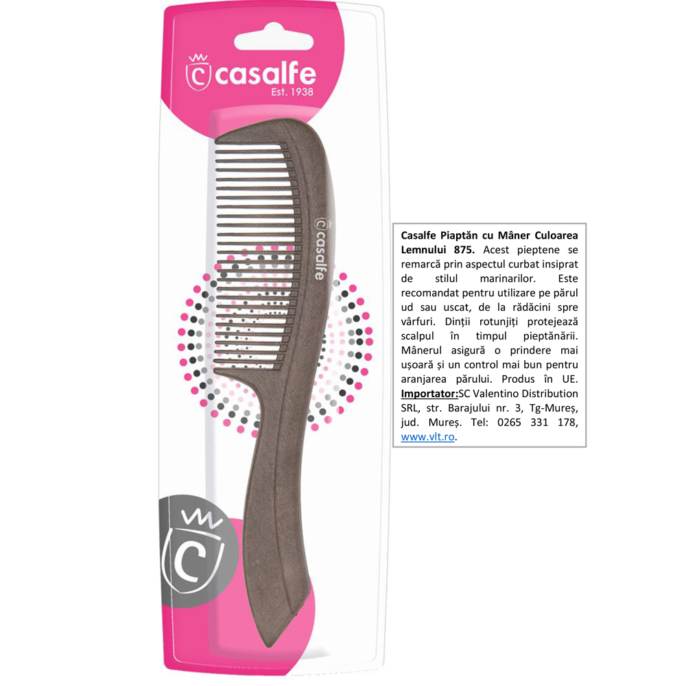 Ultima actualizare a informatiilor de prezentare pentru Pieptan pentru par cu maner culoarea lemnului, Casalfe a fost efectuata la data de 14-04-2026.