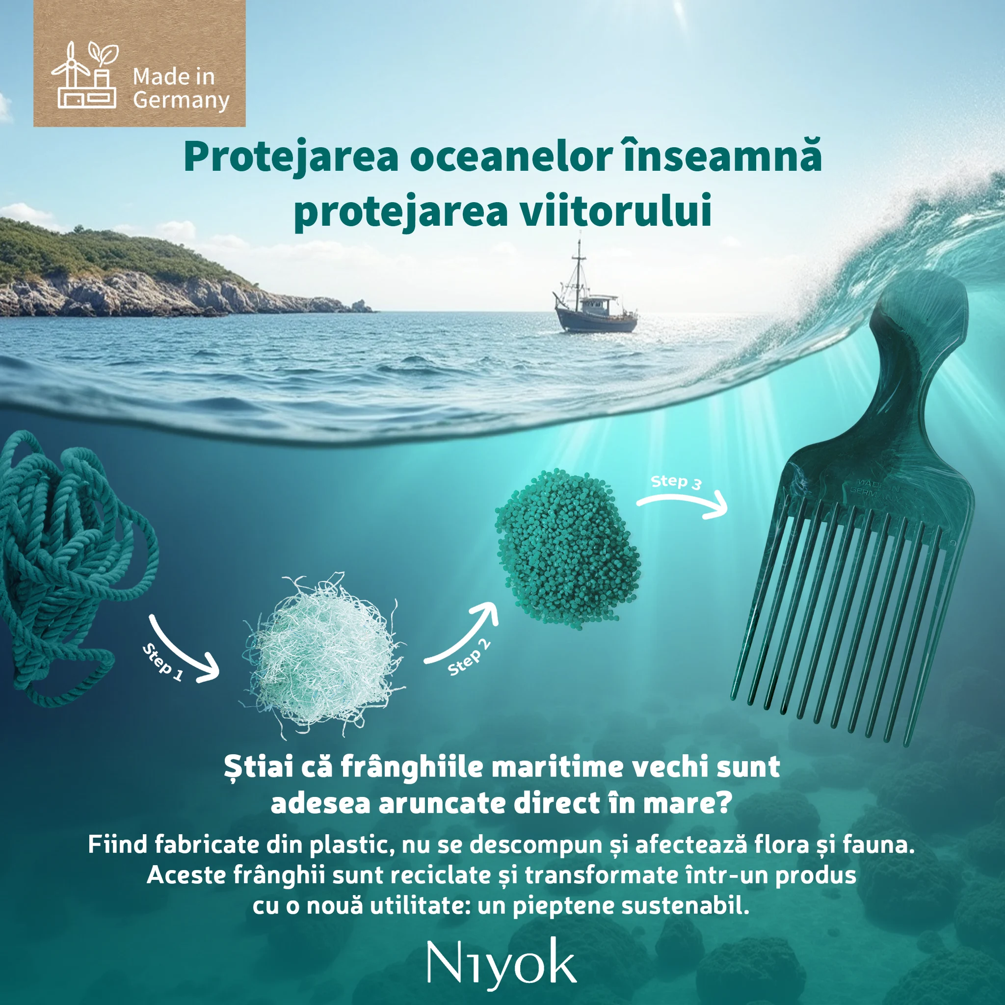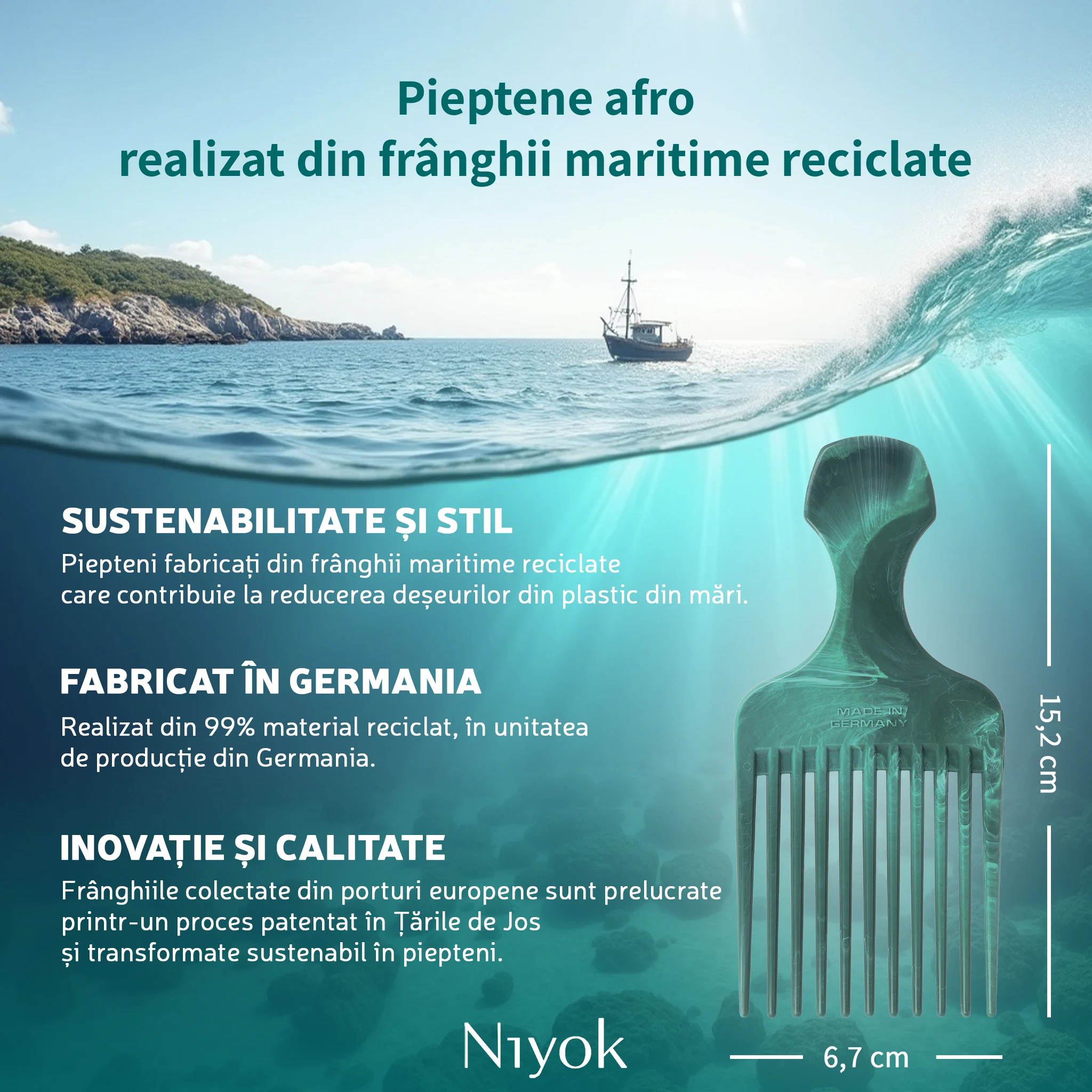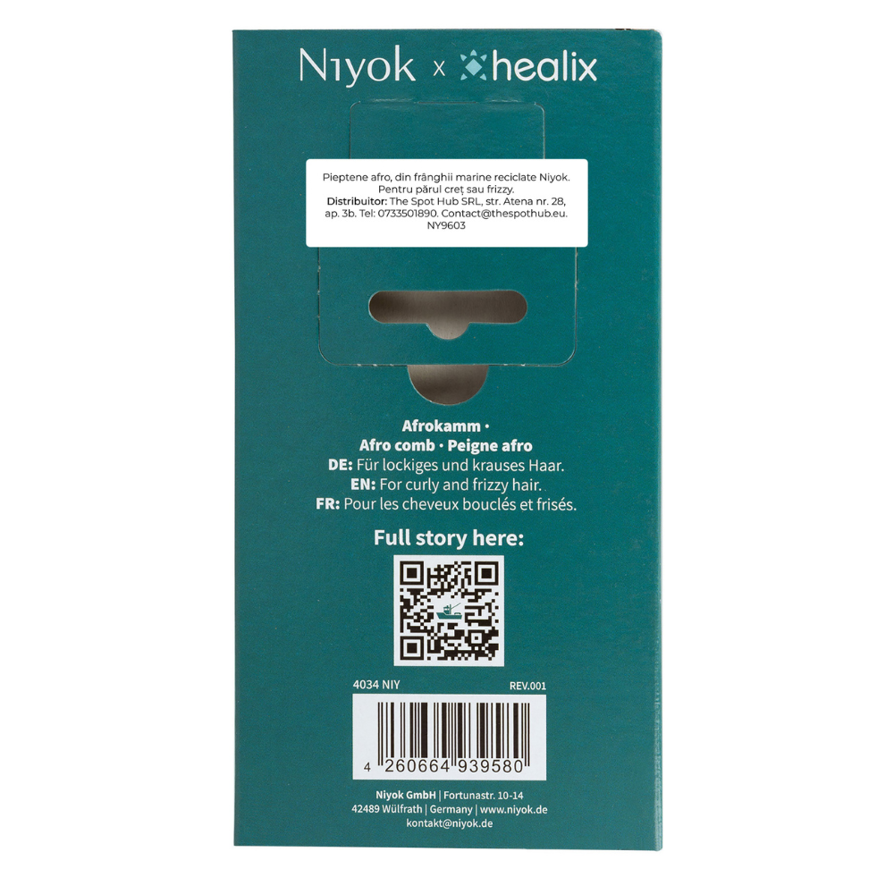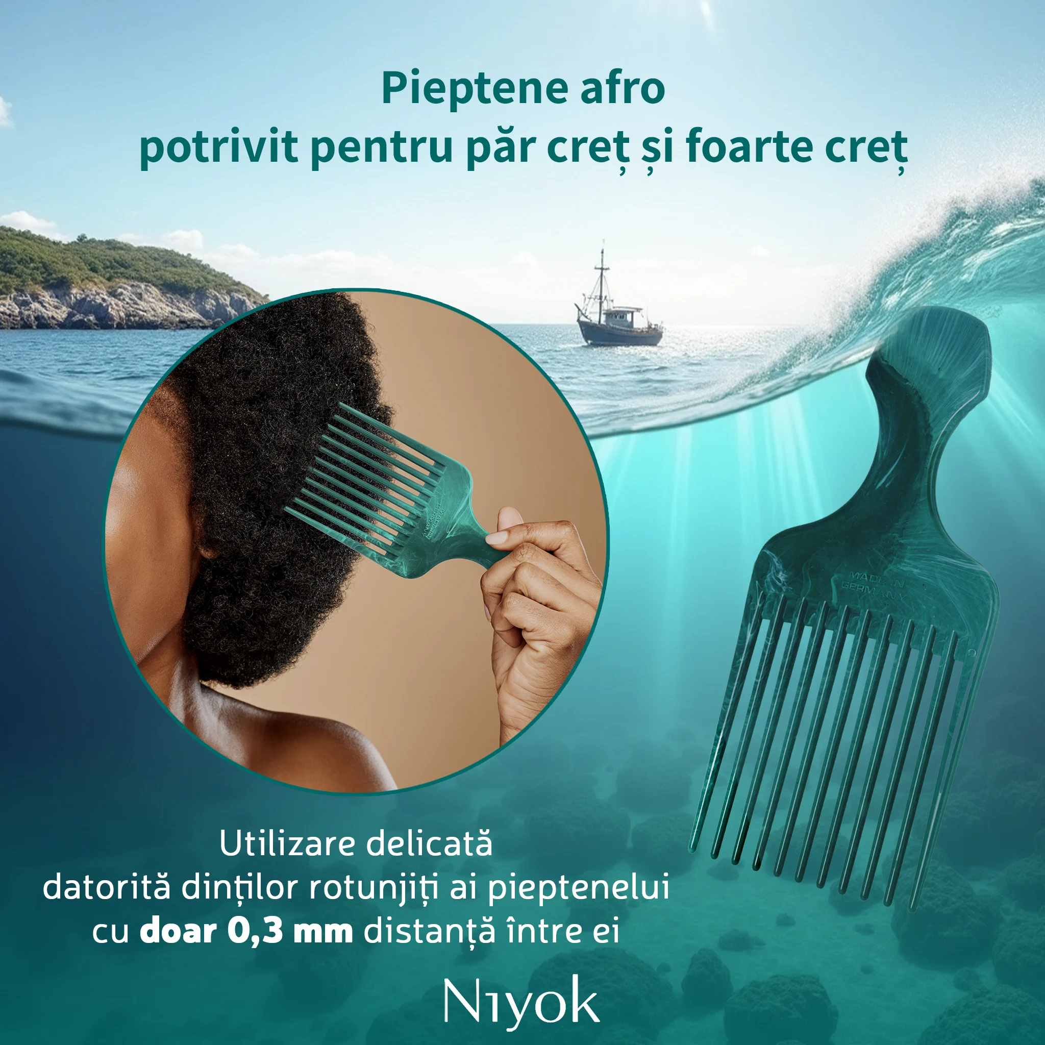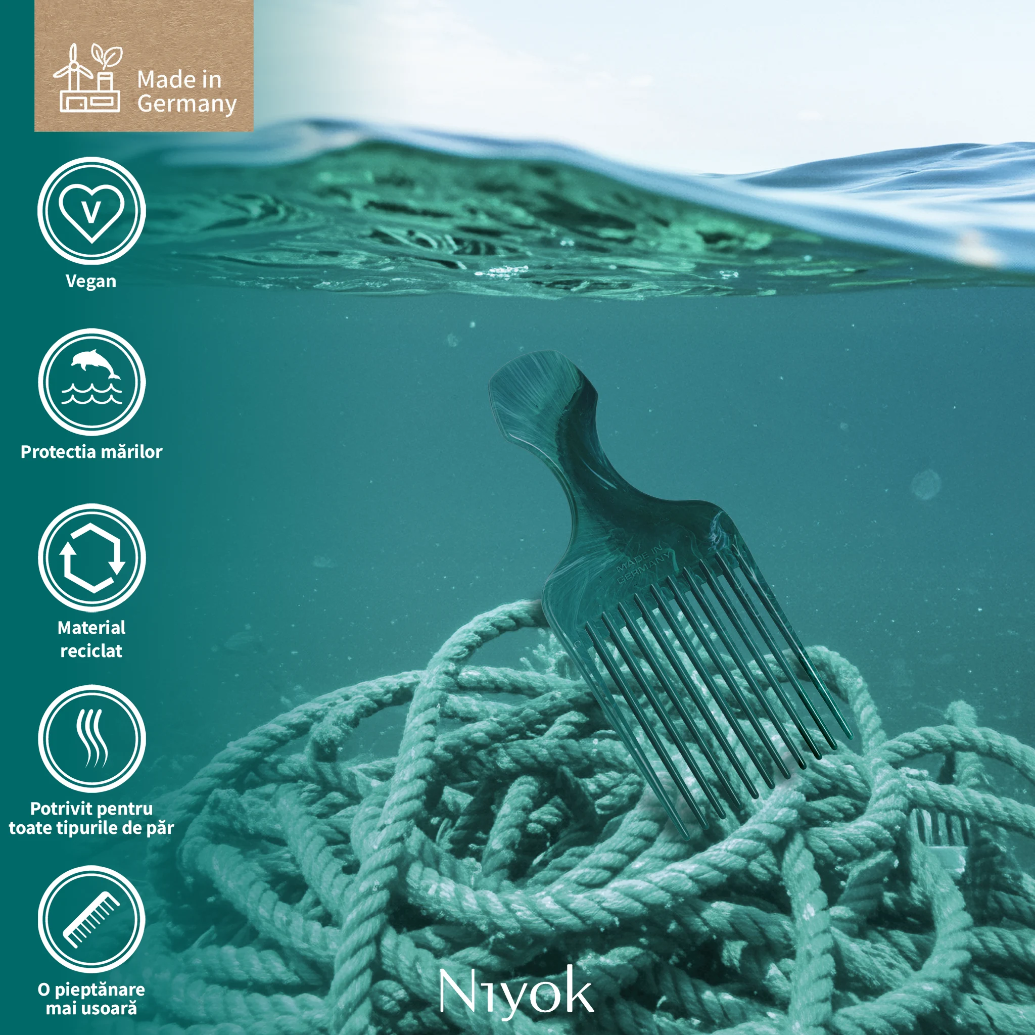 Pieptanul Afro Niyok pentru par cret, foarte cret, afro sau frizzy este un pieptan profesional, conceput special pentru a oferi descurcare delicata, volum si definire naturala, fara rupere sau electrizare. Fabricat in Germania din 99% franghii maritime reciclate, acest produs este rezultatul colaborarii Niyok x Healix, un proiect sustenabil care transforma deseurile marine in accesorii premium pentru ingrijirea parului. Datorita dintilor lati si designului ergonomic, pieptanul este ideal pentru utilizare zilnica, atat pe par umed, cat si pe par uscat sau cu produse leave-in, pastrand forma buclelor si textura naturala a parului.