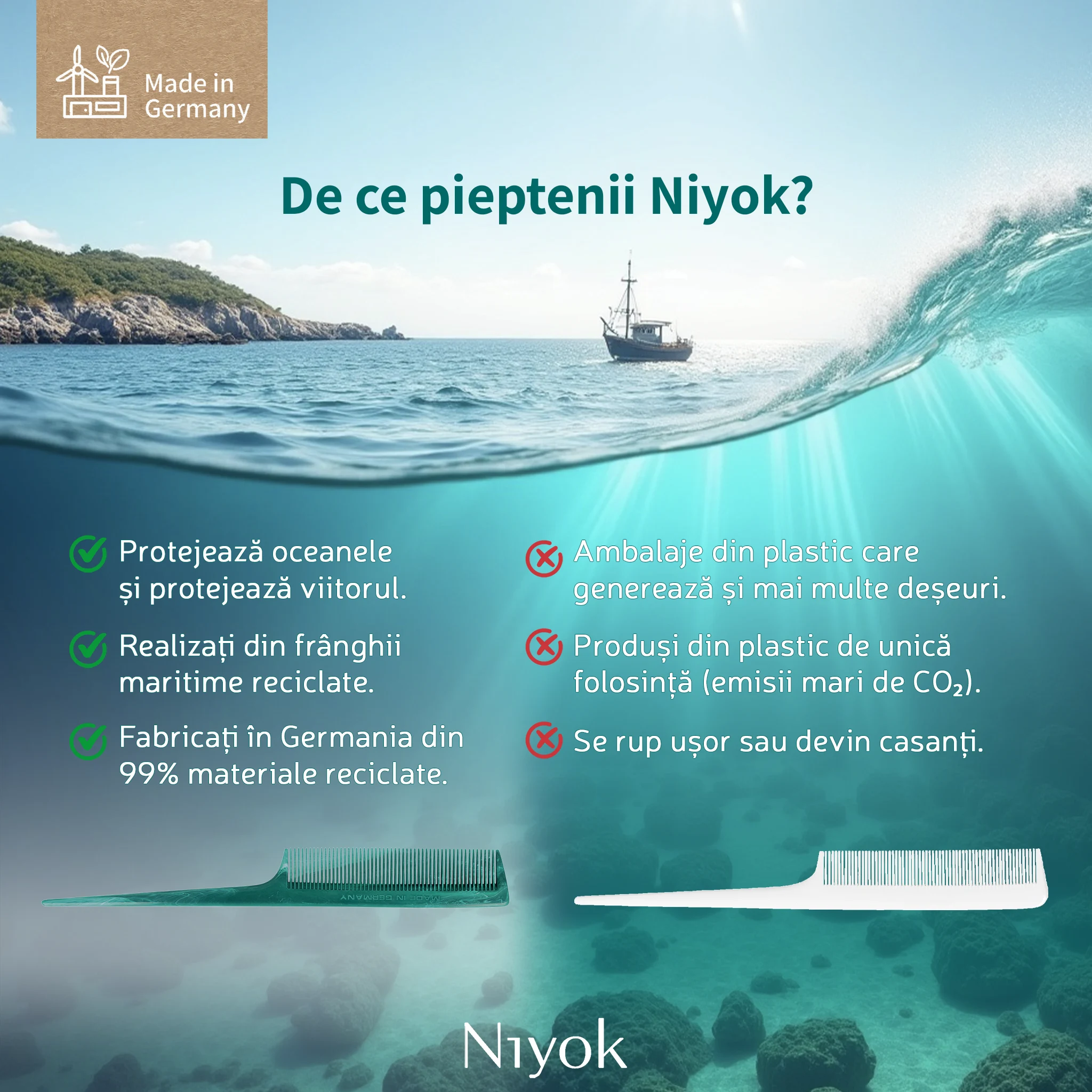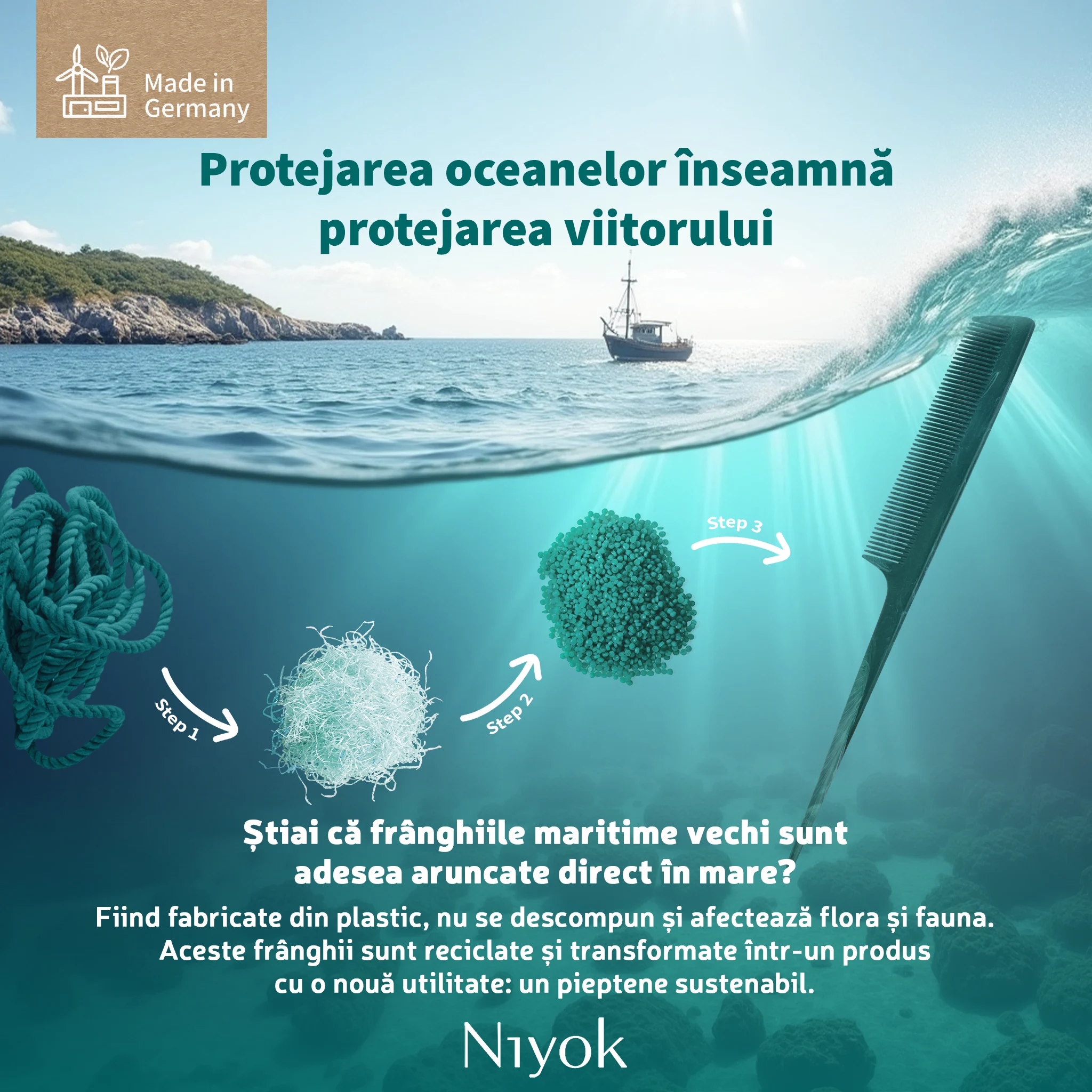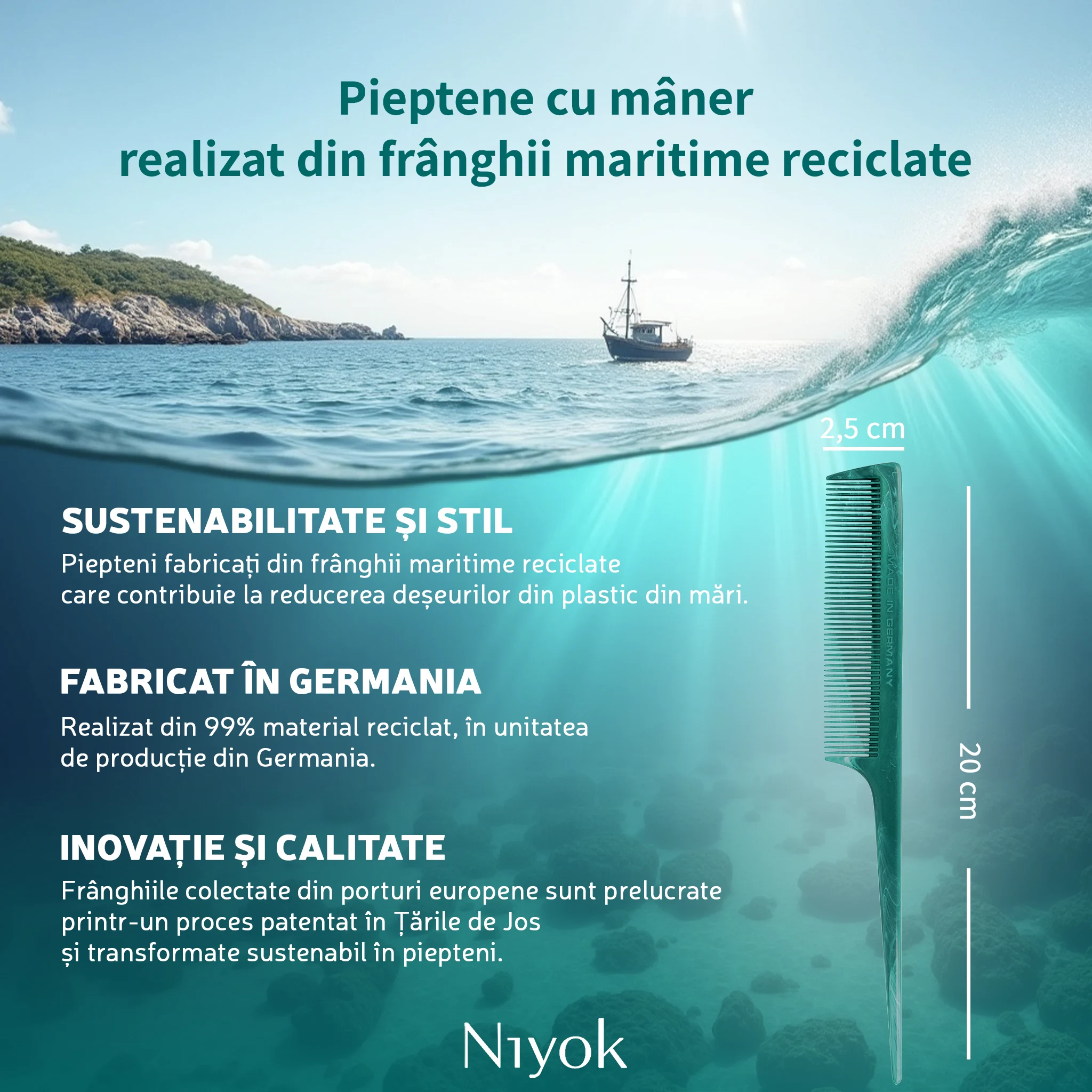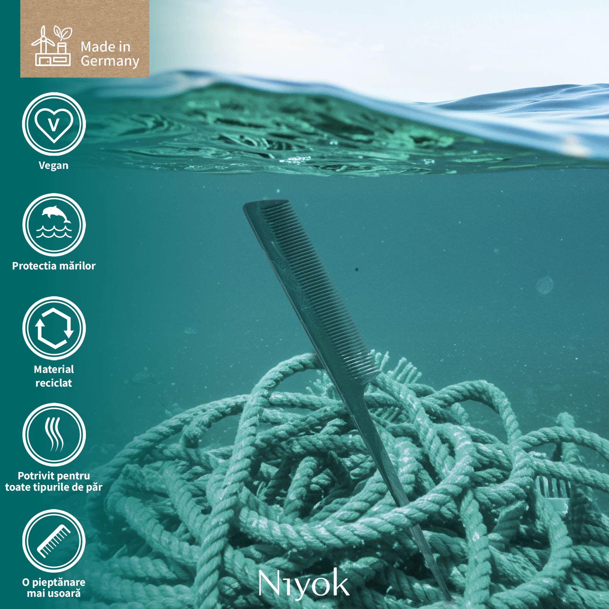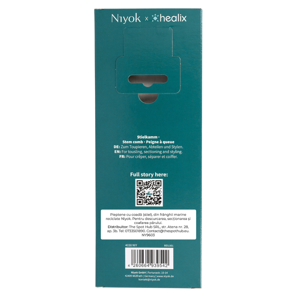 Pieptanul tail Niyok pentru sectionare precisa si styling profesional este un instrument de coafare conceput pentru rezultate exacte, garantand control maxim si sustenabilitate reala. Fabricat in Germania din 99% franghii maritime reciclate, acest pieptan este rezultatul colaborarii Niyok x Healix, un proiect european care transforma deseurile maritime in materiale premium, complet trasabile. Designul cu maner subtire de tip „tail” permite realizarea cararilor perfect drepte, sectionarea precisa a parului si aplicarea controlata a tratamentelor sau vopselelor. Este ideal atat pentru uz profesional in salon, cat si pentru styling atent acasa.