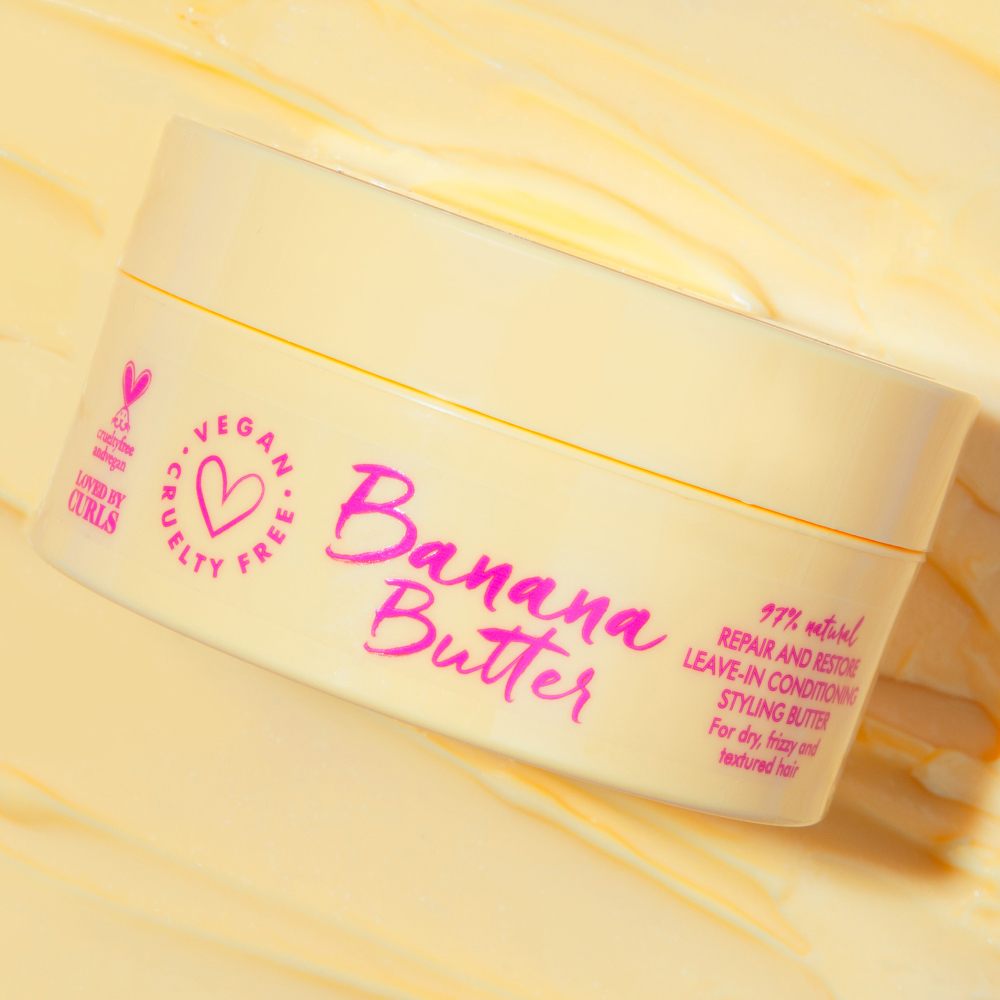 Îmbogățit cu uleiuri și unturi naturale, Banana Butter hidratează intens fibra capilară, netezește cuticula și ajută la protejarea părului împotriva ruperii și deshidratării. Rezultatul este un păr mai moale, mai suplu și mai ușor de coafat, cu bucle definite și aspect sănătos.