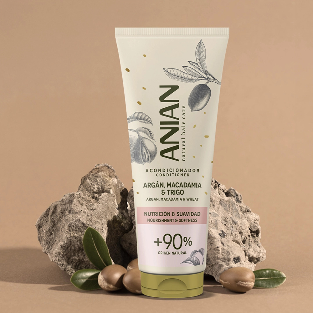 Anian Argan Macadamia este un balsam pentru păr de 250 ml, potrivit pentru păr uscat și deteriorat. Este formulat pentru a facilita coafarea și pentru a susține hidratarea. Conține ulei de argan, ulei de nucă de macadamia și proteină de grâu, asociate în descriere cu hrănire, moliciune, aspect mătăsos și strălucire. Are peste 90% ingrediente de origine naturală.