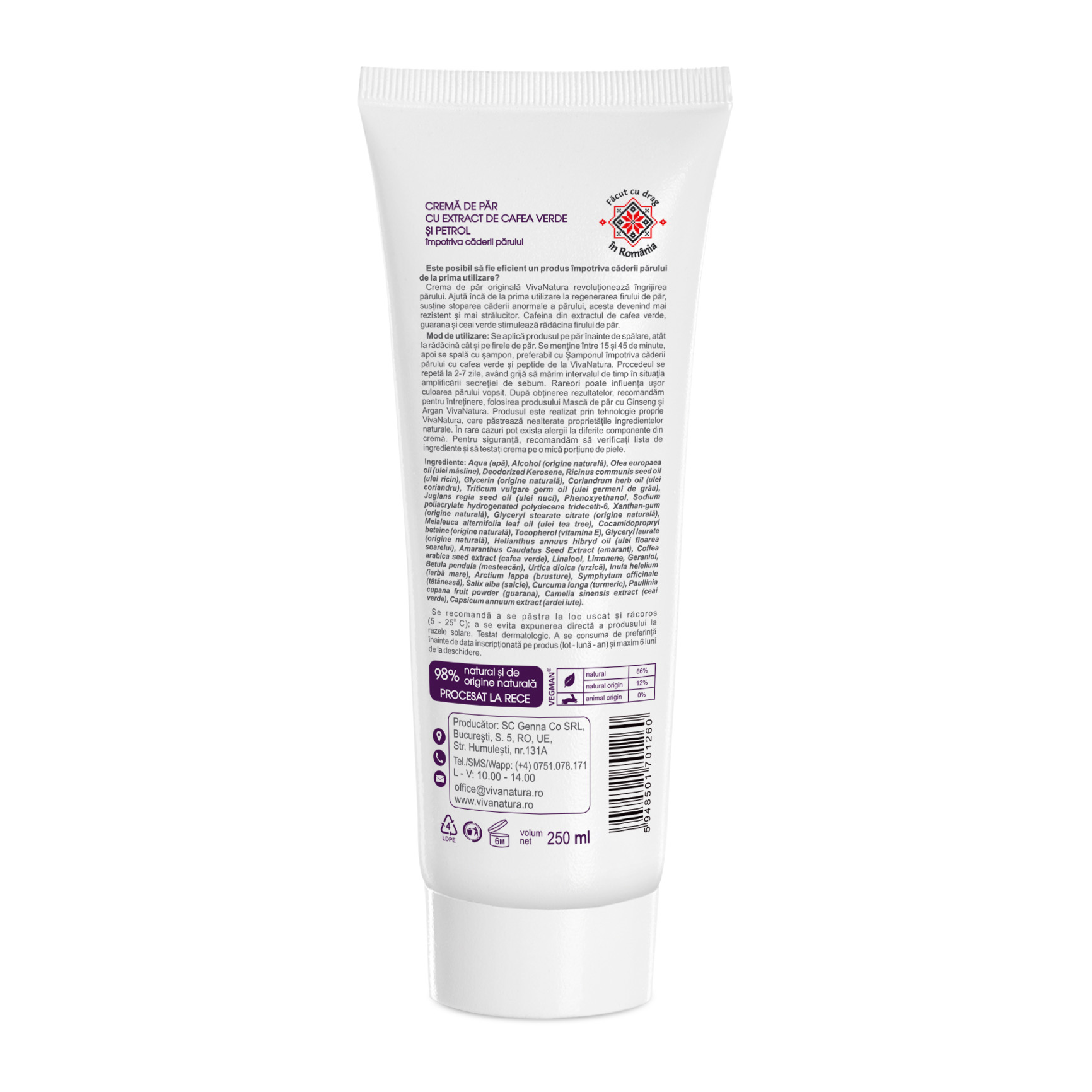 Crema de păr originală VivaNatura revoluționează îngrijirea părului. Ajută încă de la prima utilizare la regenerarea firului de păr, susține stoparea căderii anormale a părului, acesta devenind mai rezistent şi mai strălucitor. Cafeina din extractul de cafea verde, guarana şi ceai verde stimulează rădăcina firului de păr.