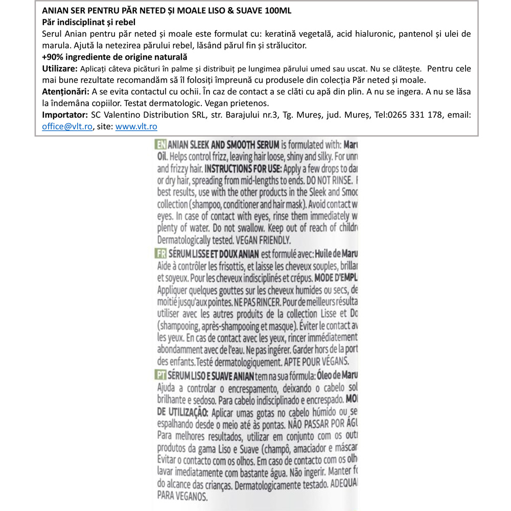 Anian Sleek&Smooth este un ser pentru păr de 100 ml, potrivit pentru păr drept și rebel. Are proprietăți hrănitoare și include ingrediente care pătrund în firul de păr, ajutând la sigilarea vârfurilor. Contribuie la controlul părului rebel, pentru un aspect mai neted, strălucitor și mătăsos. Este testat dermatologic.