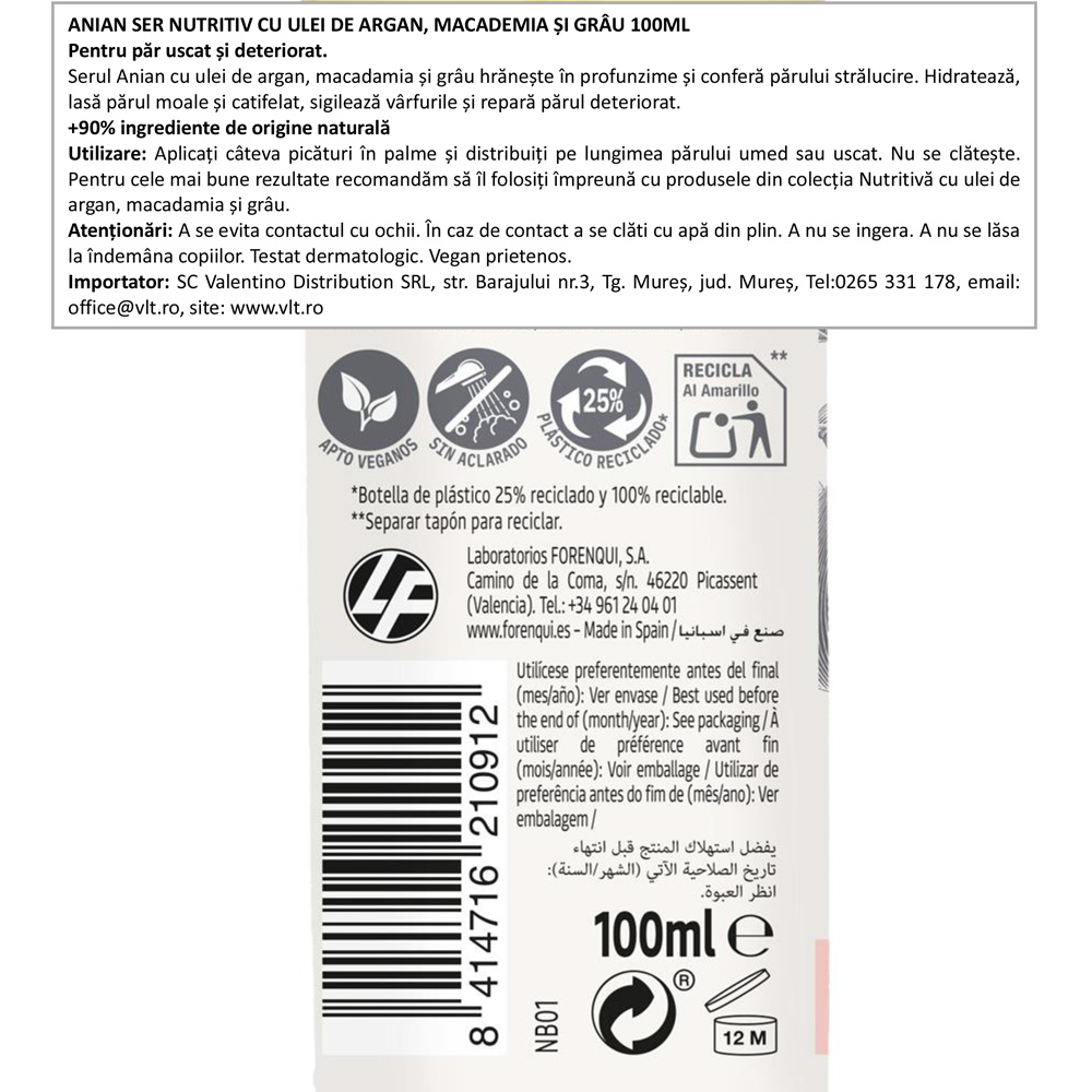 Anian Argan Macadamia este un ser pentru păr de 100 ml, potrivit pentru păr uscat și deteriorat. Formula conține uleiuri naturale care intensifică strălucirea și ajută la îngrijirea vârfurilor despicate. Include ulei de argan și ulei de nucă de macadamia pentru hrănire și hidratare, lăsând părul mai moale și mătăsos.