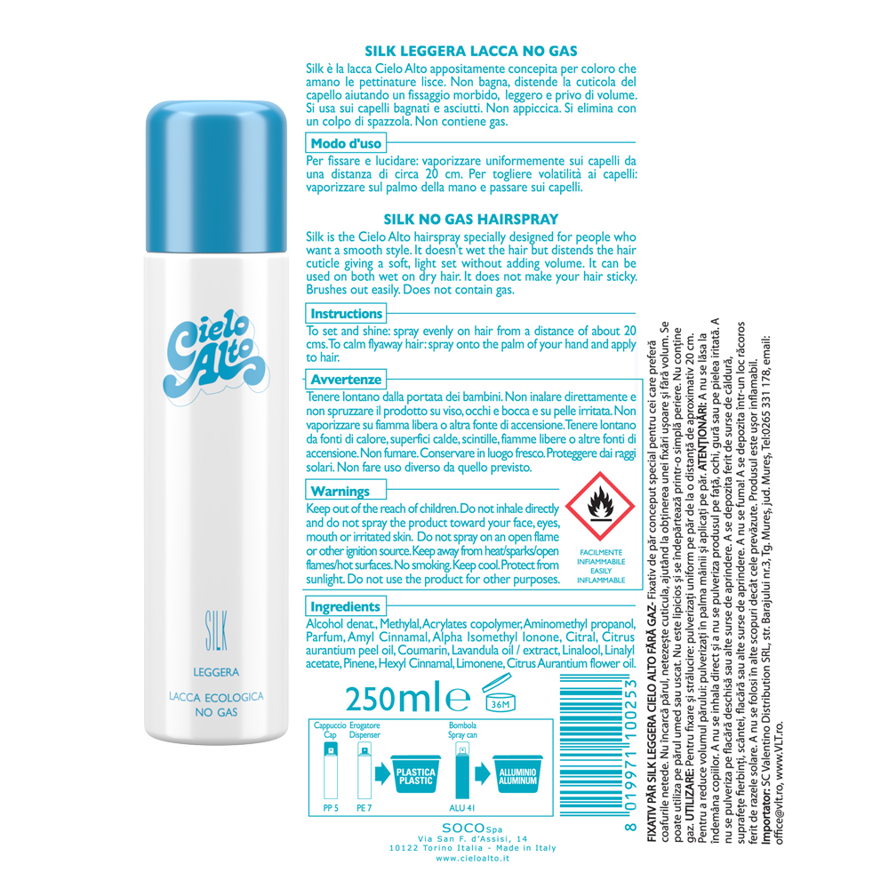 Fixativ pentru păr, fără gaz, conceput pentru coafuri netede și finisaje fine. Formula sa ajută la netezirea cuticulei firului de păr și oferă o fixare ușoară, fără volum, pentru un aspect mătăsos și disciplinat, fără efect lipicios.
