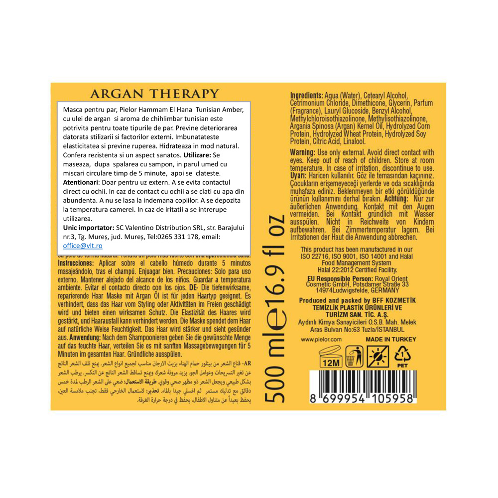 Masca pentru par Pielor Hammam El Hana cu ulei de argan si aroma de chihlimbar tunisian este potrivita pentru toate tipurile de par.