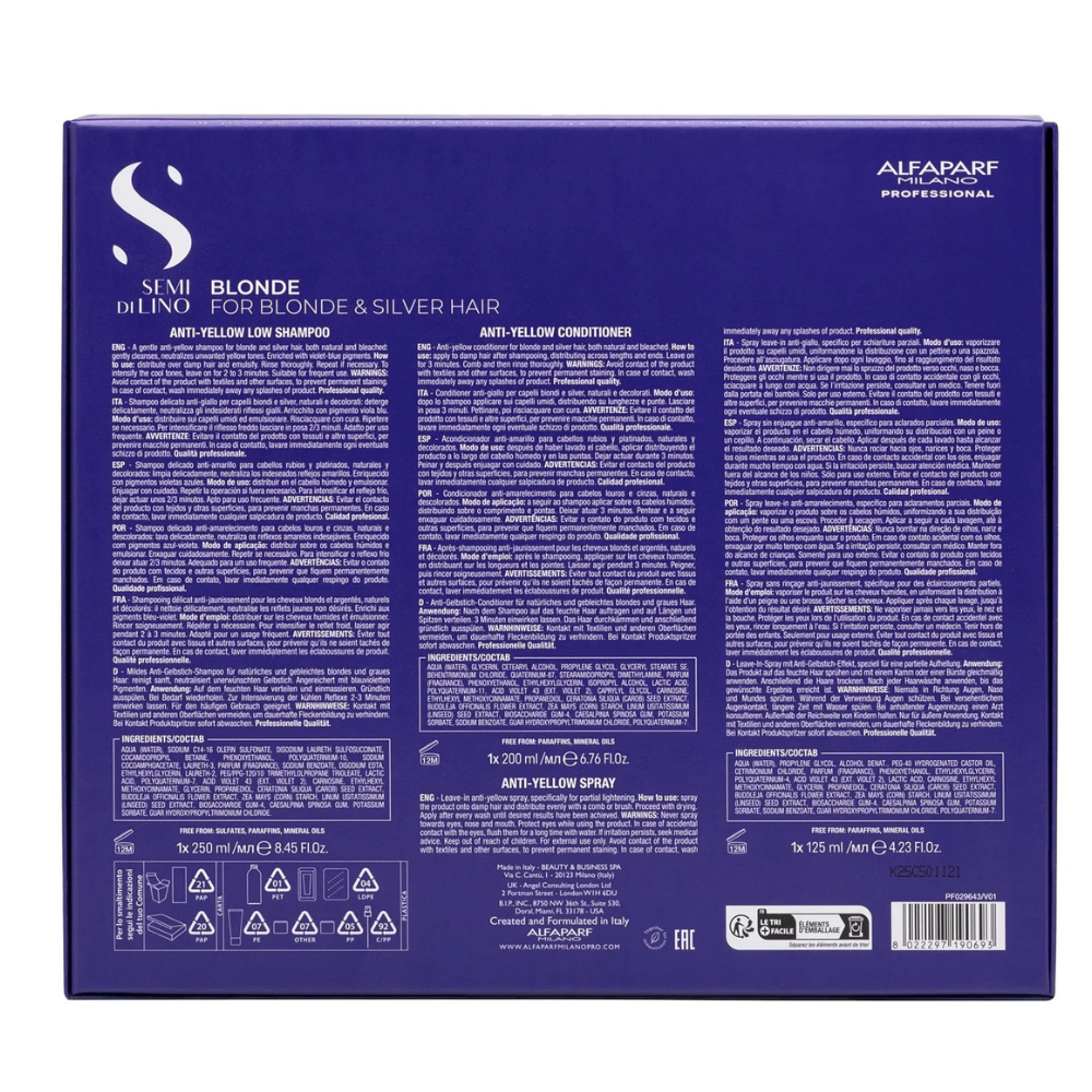 Răsfață-ți părul blond cu Holiday Kit SDL Blonde de la Alfaparf Milano, un set premium care neutralizează reflexele galbene, hidratează intens și redă luminozitatea culorii. Conține șampon, balsam și spray anti-galben, formulate cu pigment violet și complexe protectoare de ultimă generație, pentru un blond rece, vibrant și plin de vitalitate.