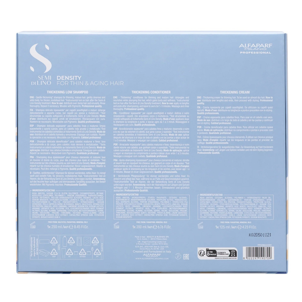Holiday Kit SDL Density, 250ml + 200ml + 125ml, Alfaparf Milano – un set premium din gama Semi di Lino Density, conceput pentru părul subțire, fragil sau lipsit de vitalitate. Formula inovatoare cu Filler Complex redă densitate, elasticitate și volum, în timp ce complexele exclusive Urban Defence Pro, Shine Fix și Color Fix oferă protecție, strălucire și culoare de durată. Ideal pentru un păr revitalizat, vizibil mai plin și sănătos.