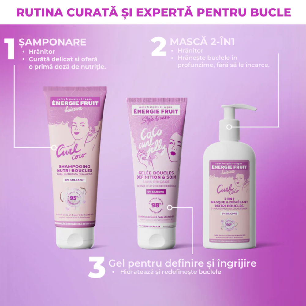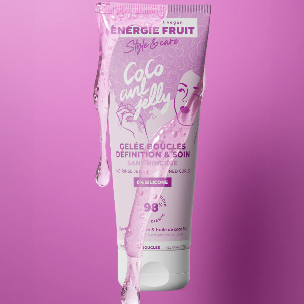 Descoperă Gelul fără clătire pentru bucle definite Energie Fruit, cu ulei de cocos organic, formulă naturală și vegană care hrănește, definește și reactivează buclele fără a le încărca. Ideal pentru metoda Curly Girl, oferă bucle elastice, definite și protejate împotriva umidității, fără efect cartonat.