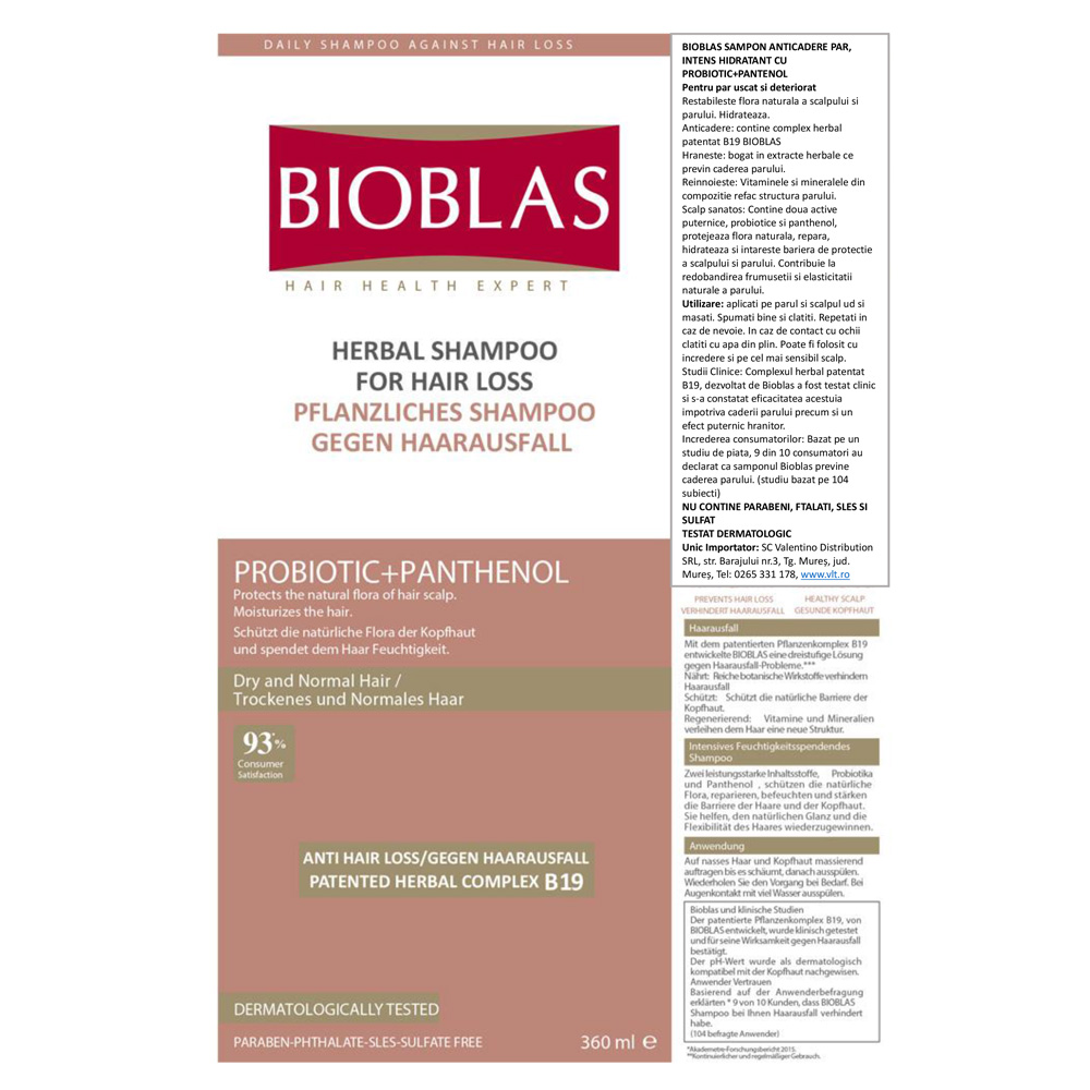 Ultima actualizare a informatiilor de prezentare pentru Sampon anticadere pentru parul uscat si deteriorat Probiotic+Panthenol, 360 ml, Bioblas a fost efectuata la data de 17-04-2026.  |  Raporteaza Descriere Gresita