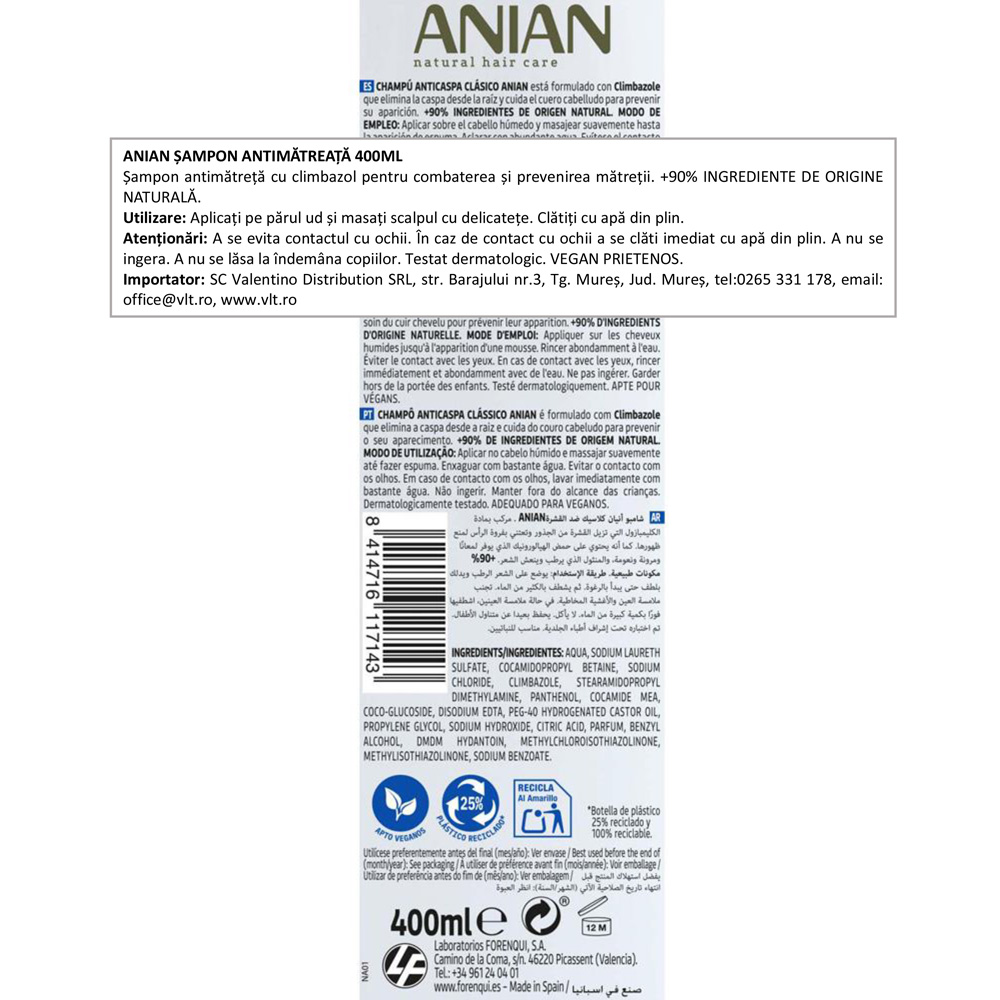 Anian este un șampon antimătreață de 400 ml, cu climbazol pentru combaterea și prevenirea mătreții. Este potrivit pentru rutina de îngrijire a părului atunci când apare mătreața și se dorește o curățare eficientă a scalpului. Formula este testată dermatologic, vegan prietenos și are peste 90% ingrediente de origine naturală.