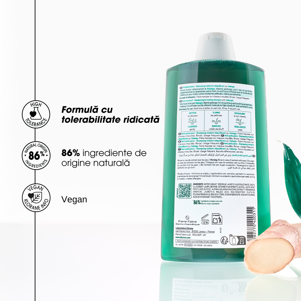 - incă de la prima aplicare, șamponul Klorane Galangal ajută la eliminarea matretii uscate si uleioase până la 100% și diminueaza reapariția acesteia timp de până la 7 zile după ce ați încetat să o utilizați;