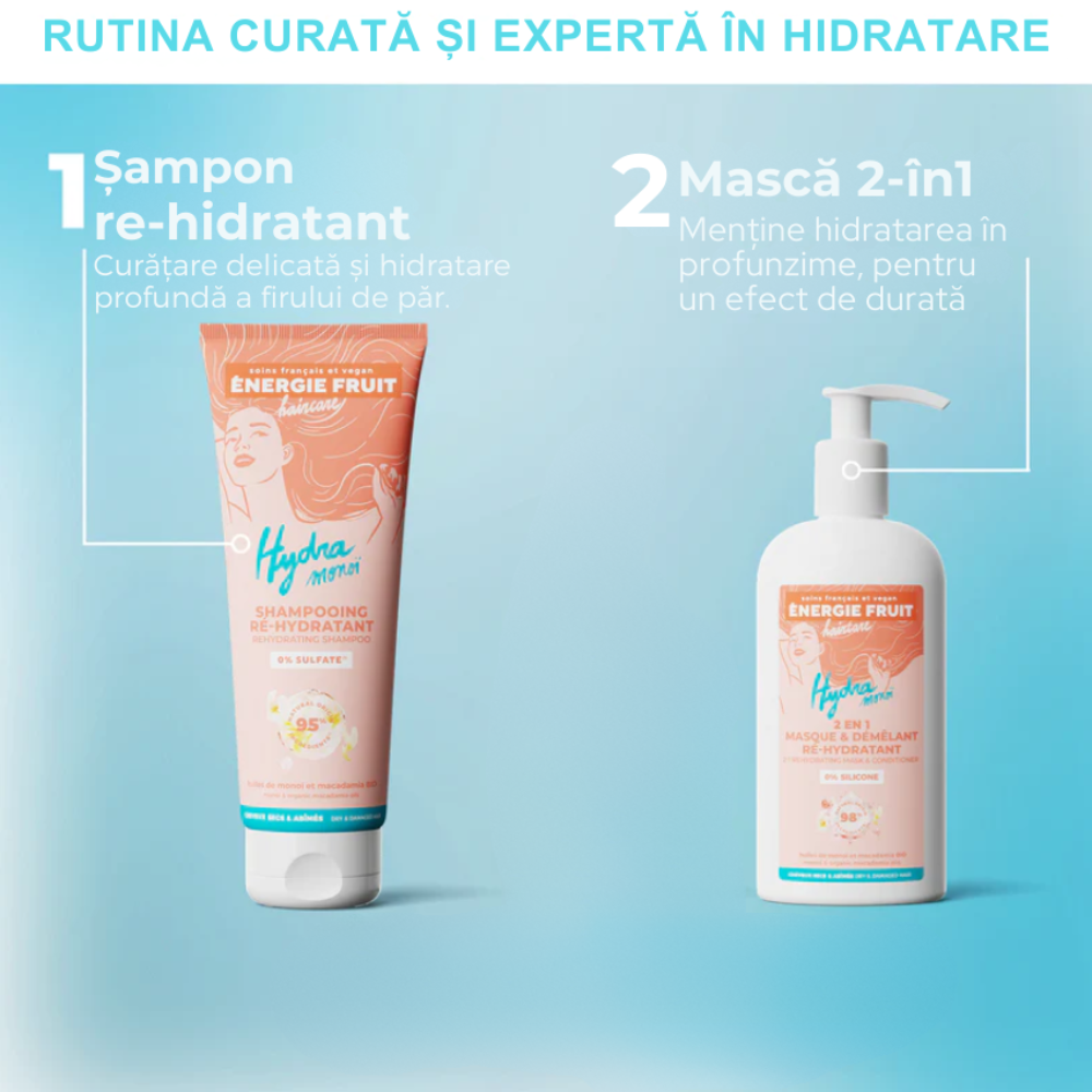 Descoperă șamponul hidratant Energie Fruit cu monoi și ulei de macadamia organic – soluția naturală pentru păr uscat, tern sau deteriorat. Curăță delicat, fără a agresa scalpul, oferind hidratare intensă, strălucire și catifelare naturală, datorită formulei vegane cu 95% ingrediente de origine naturală, certificat Ecocert COSMOS.