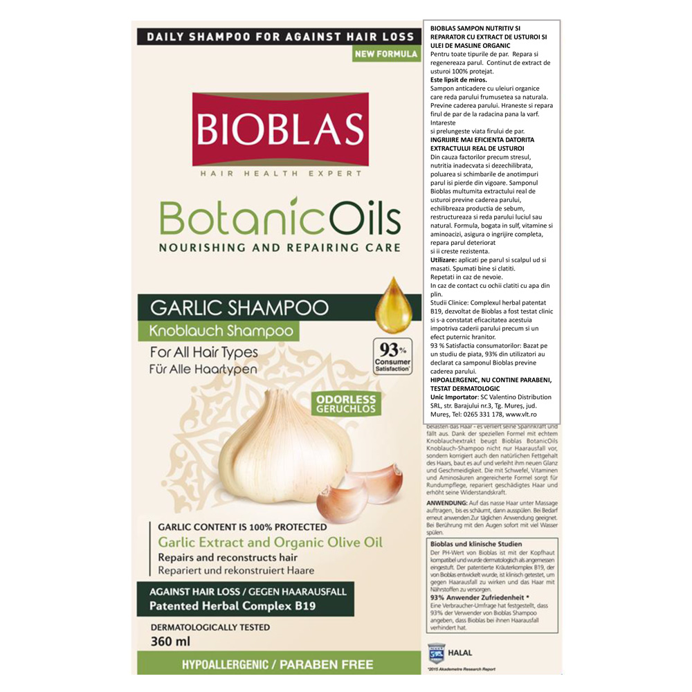 Continut de extract de usturoi 100% protejat. Este lipsit de miros. Sampon anticadere cu uleiuri organice care reda parului frumusetea sa naturala. Previne caderea parului. Hraneste si repara firul de par de la radacina pana la varf. Intareste si prelungeste viata firului de par.
