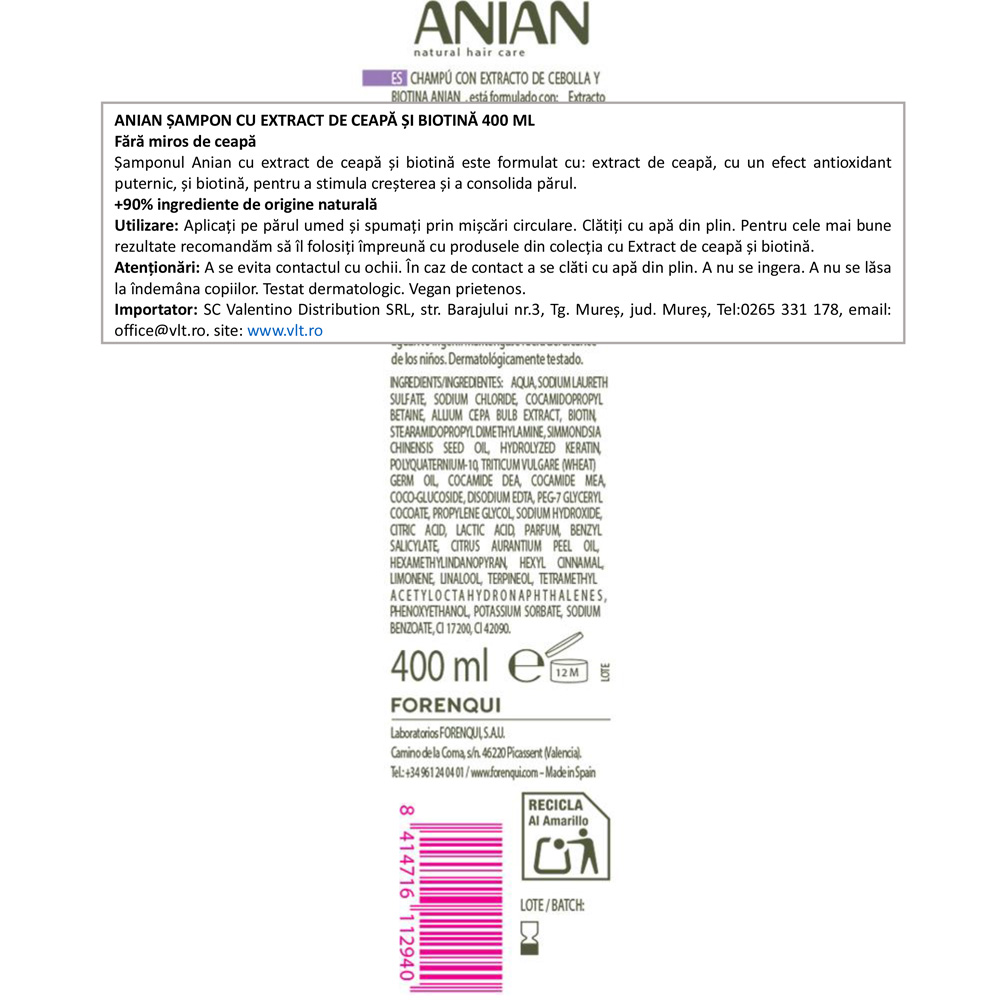 Anian Onion&Biotin este un È™ampon de 400 ml, potrivit pentru păr fragil, cu tendință de cădere. Curăță în profunzime È™i este descris ca sprijinind întărirea firului de păr È™i stimularea creÈ™terii. ConÈ›ine extract de ceapă È™i biotină, iar formula este fără miros de ceapă. Are peste 90% ingrediente de origine naturală.