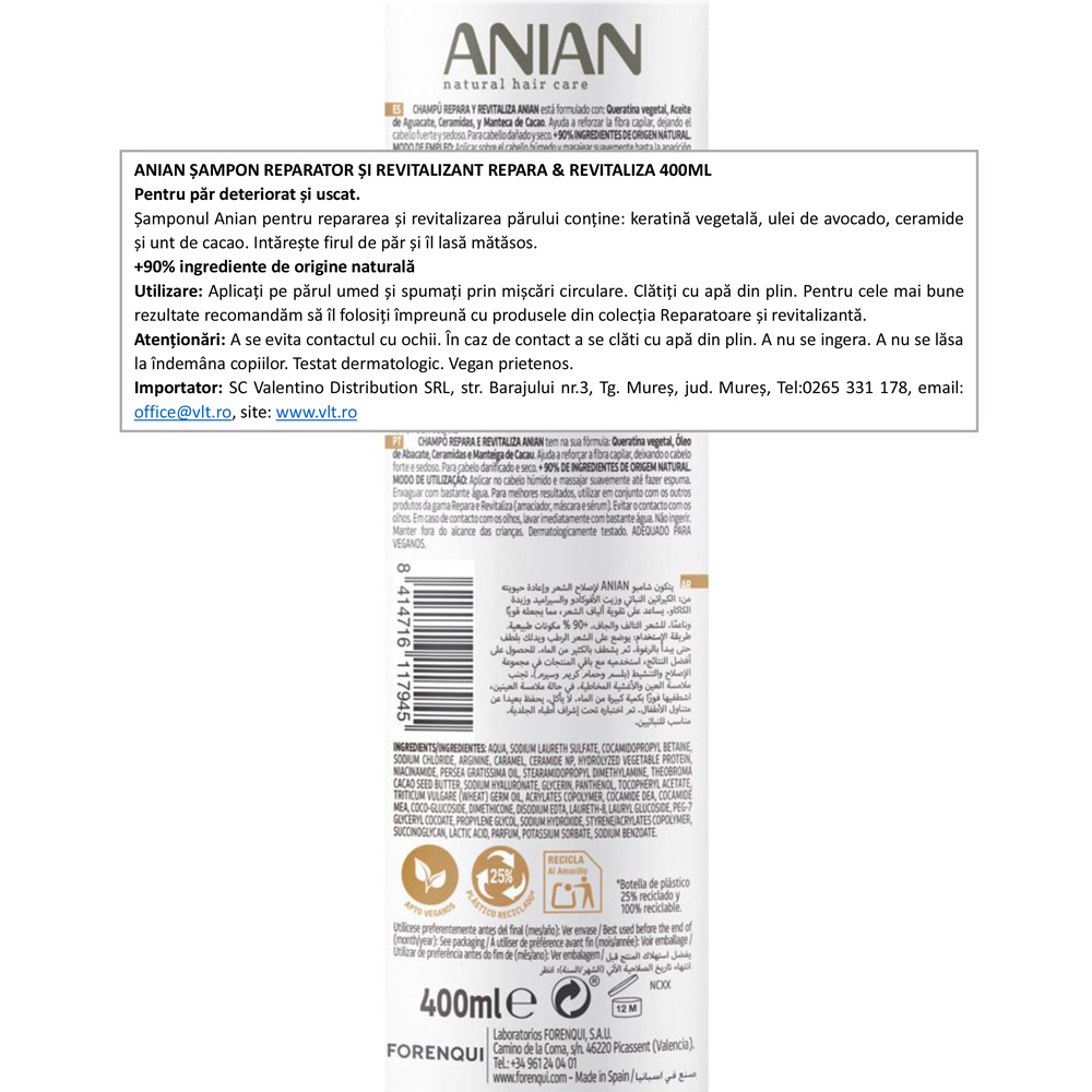 Anian Repair&Revital este un șampon de 400 ml pentru păr uscat și deteriorat, creat pentru curățare și îngrijire a fibrei capilare. Conține ulei de avocado, cheratină vegetală și unt de cacao pentru hrănire, hidratare și un aspect mai catifelat. Ajută la întărirea părului, la îngrijirea vârfurilor și la susținerea strălucirii naturale. Are peste 90% ingrediente de origine naturală.