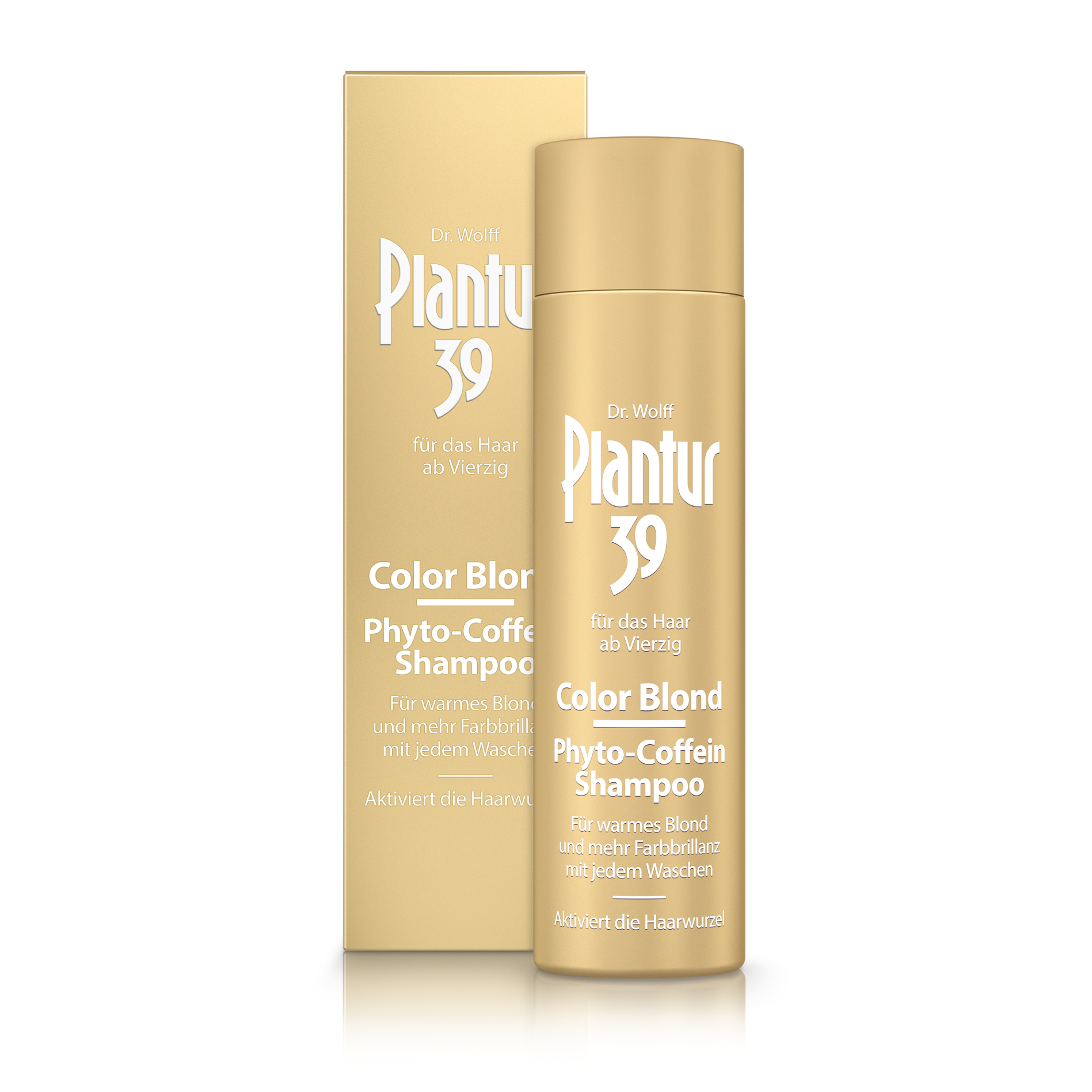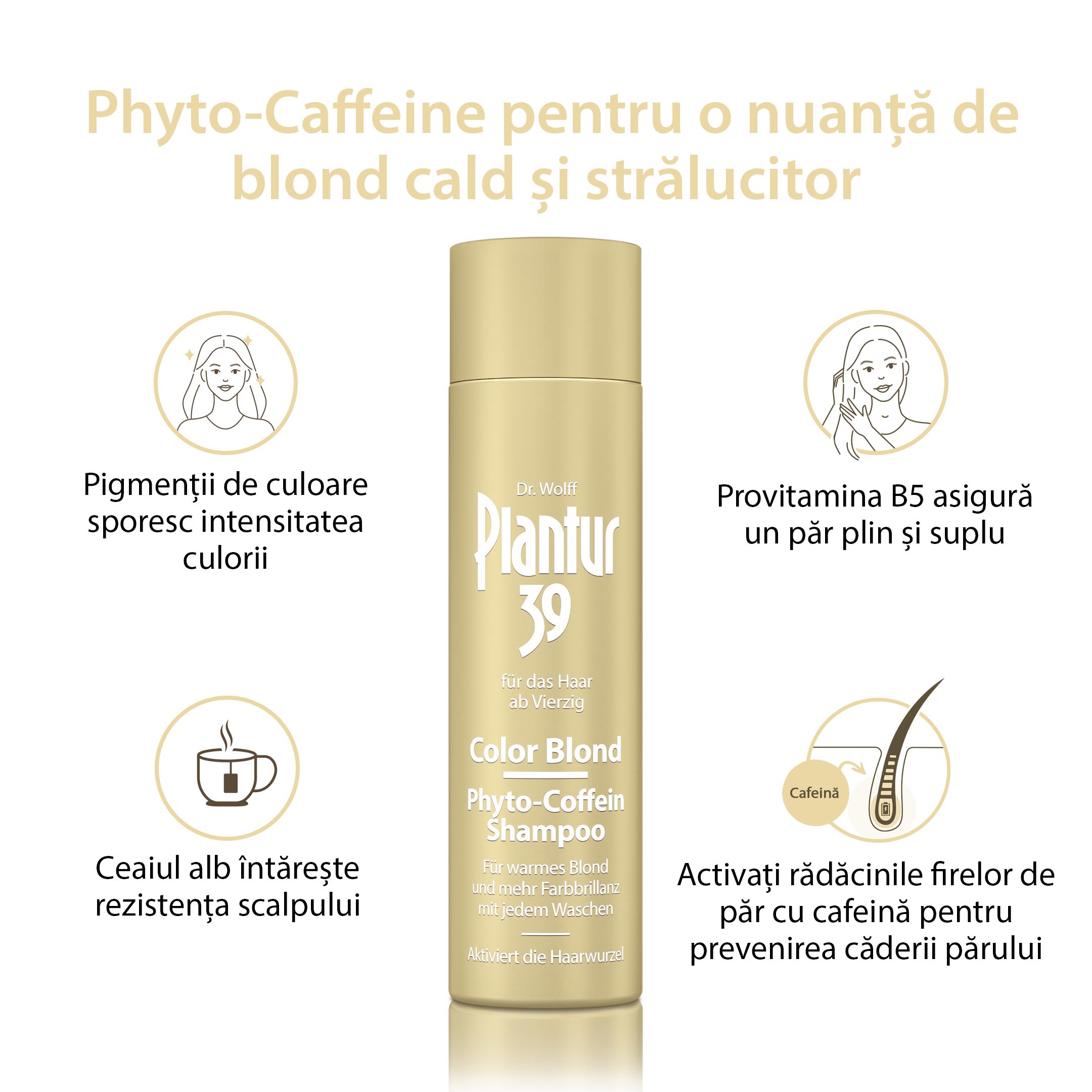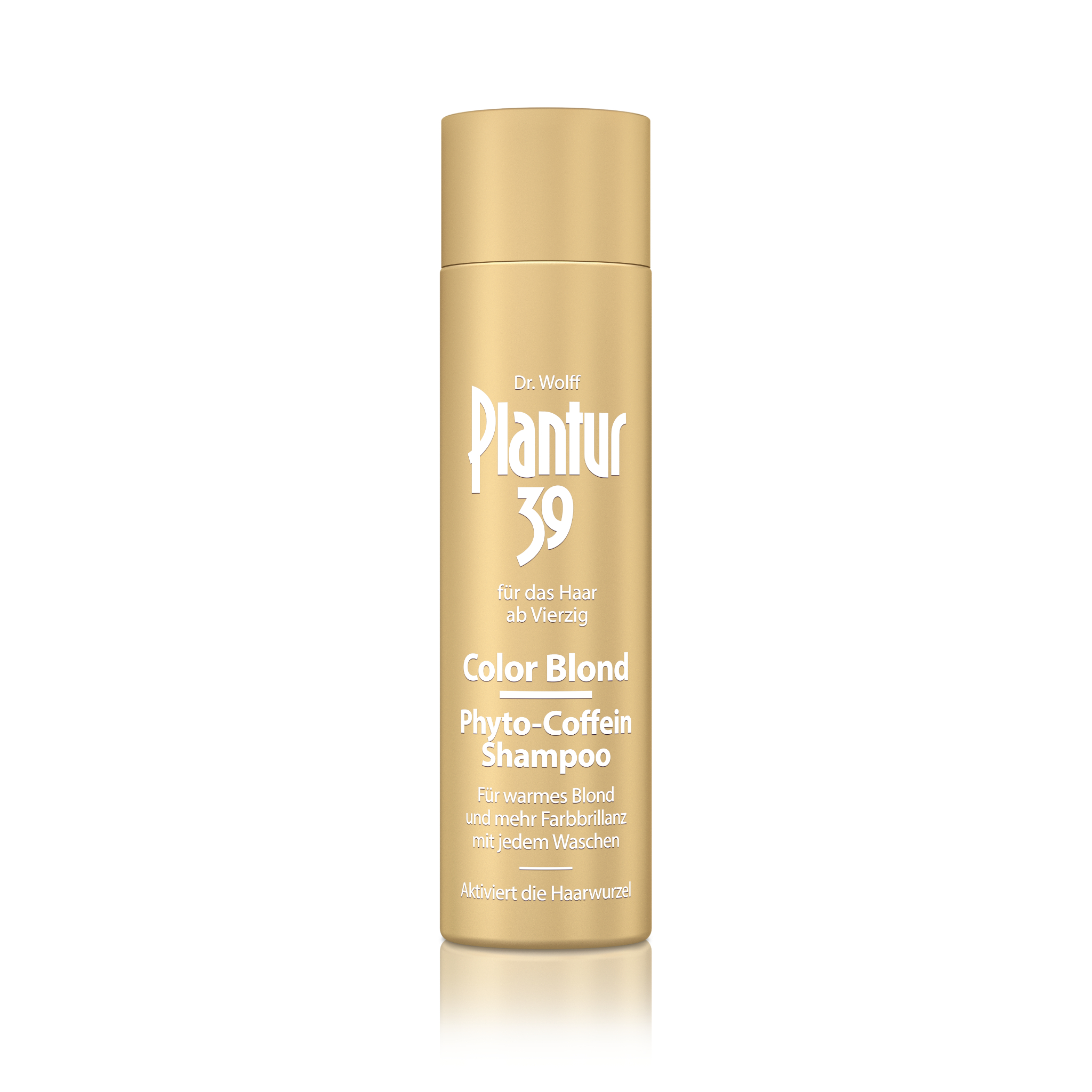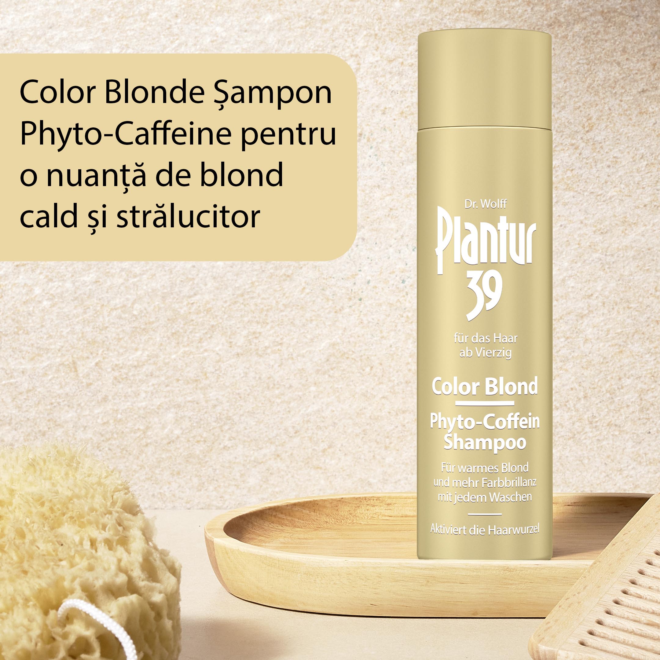 Șampon Plantur 39 Color Blonde Phyto-Caffeine, special conceput pentru părul blond, ajută la intensificarea nuanței și oferă îngrijire zilnică, contribuind la un aspect uniform și luminos al părului.