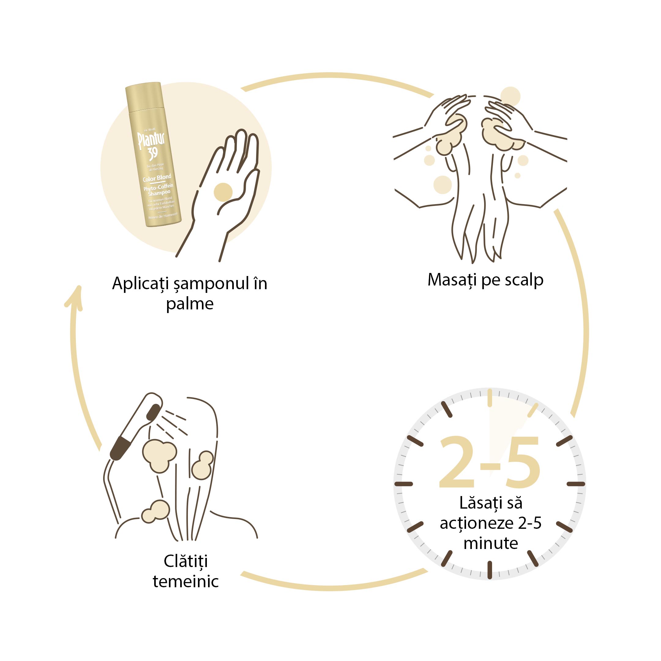 În funcție de intensitatea dorită, lăsați șamponul să acționeze 2–5 minute, apoi clătiți bine.