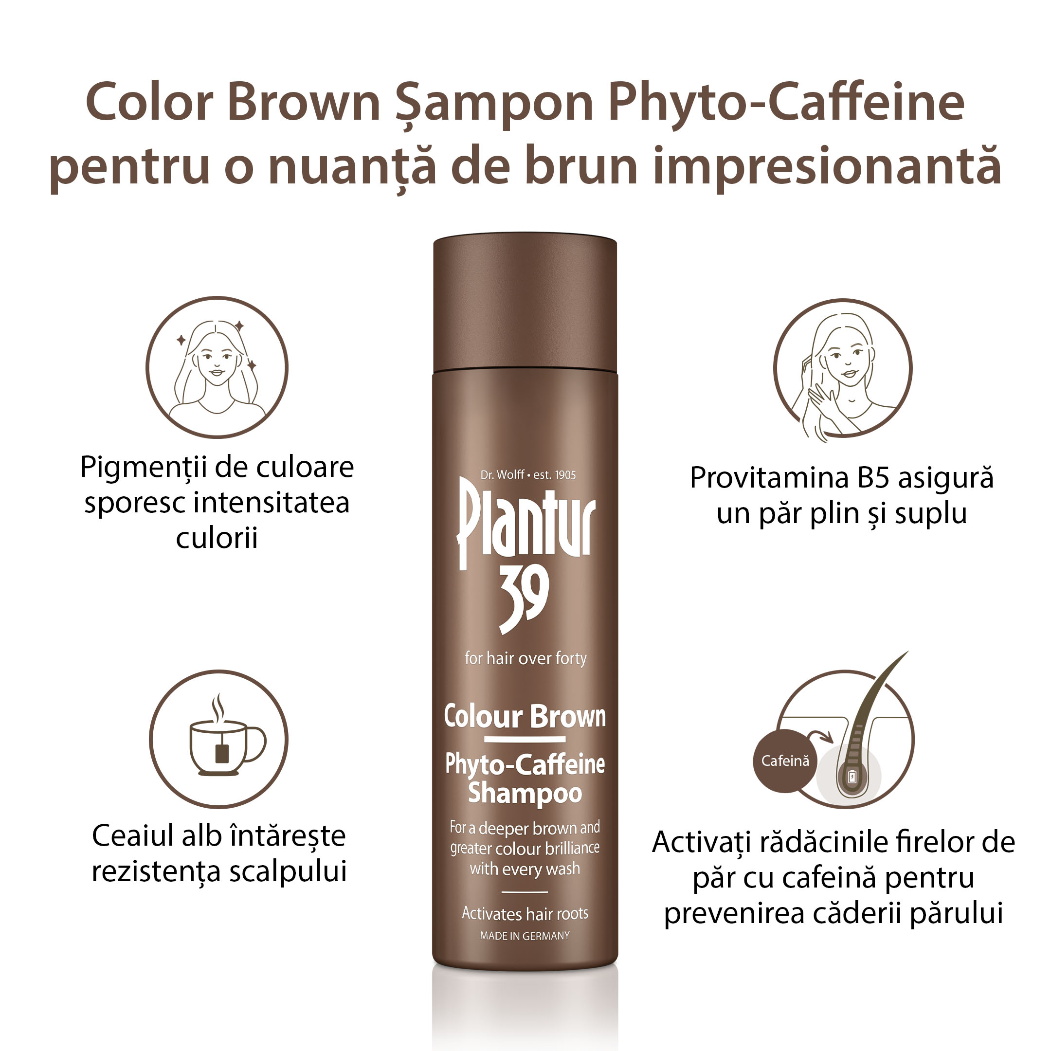 Șampon Plantur 39 Colour Brown Phyto-Caffeine, special formulat pentru părul castaniu, ajută la intensificarea nuanței și oferă îngrijire zilnică pentru un aspect uniform și strălucitor.