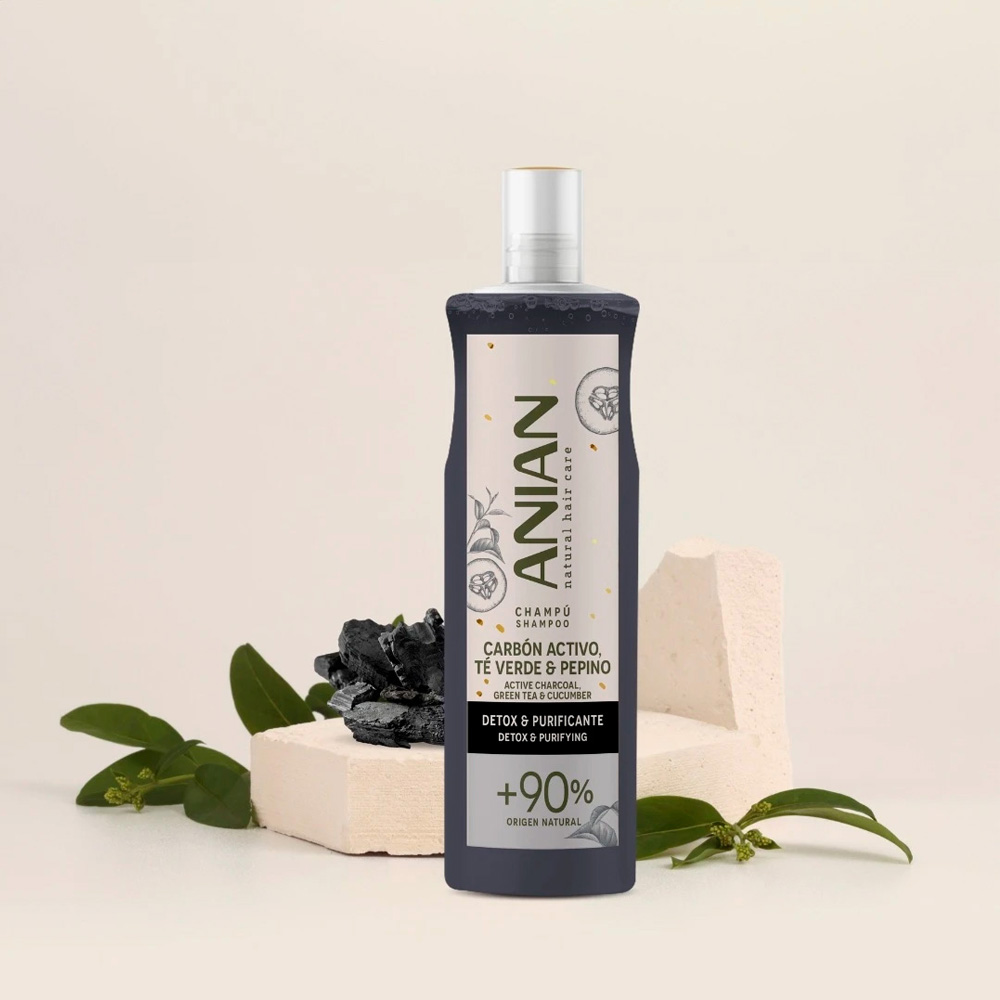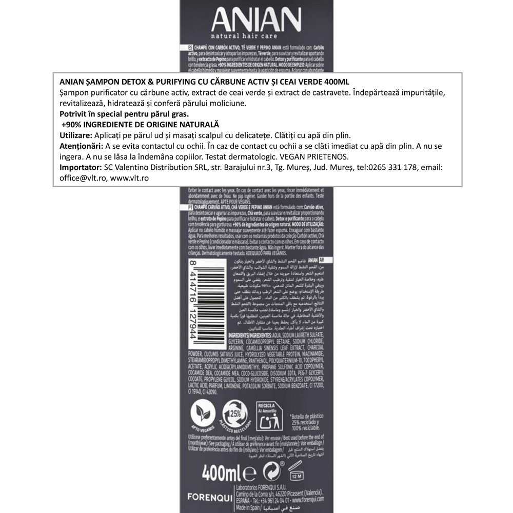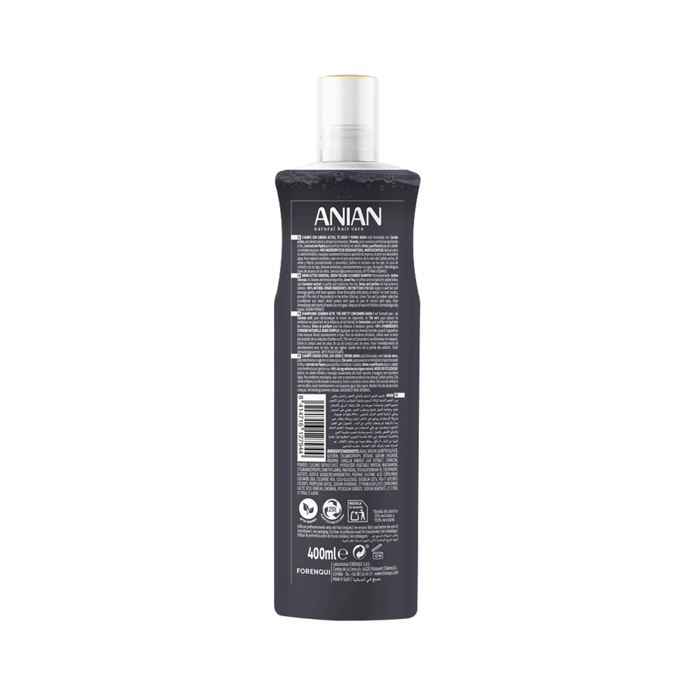 Anian Active Charcoal&Green Tea este un șampon purificator de 400 ml, potrivit pentru păr gras. Conține cărbune activ, extract de ceai verde și extract de castravete, pentru îndepărtarea impurităților și o senzație de prospețime. Ajută la revitalizare, hidratare și la obținerea unui păr mai moale. Formula este vegan prietenos și testată dermatologic.